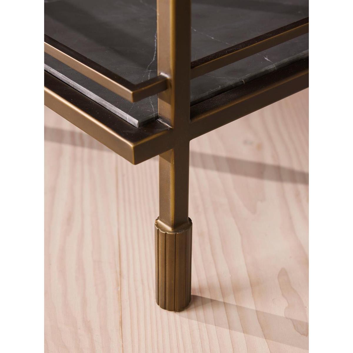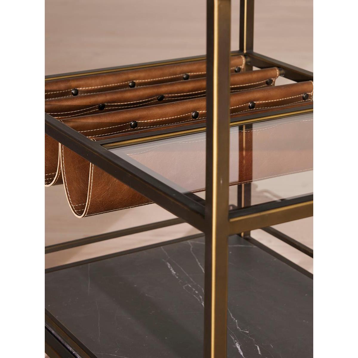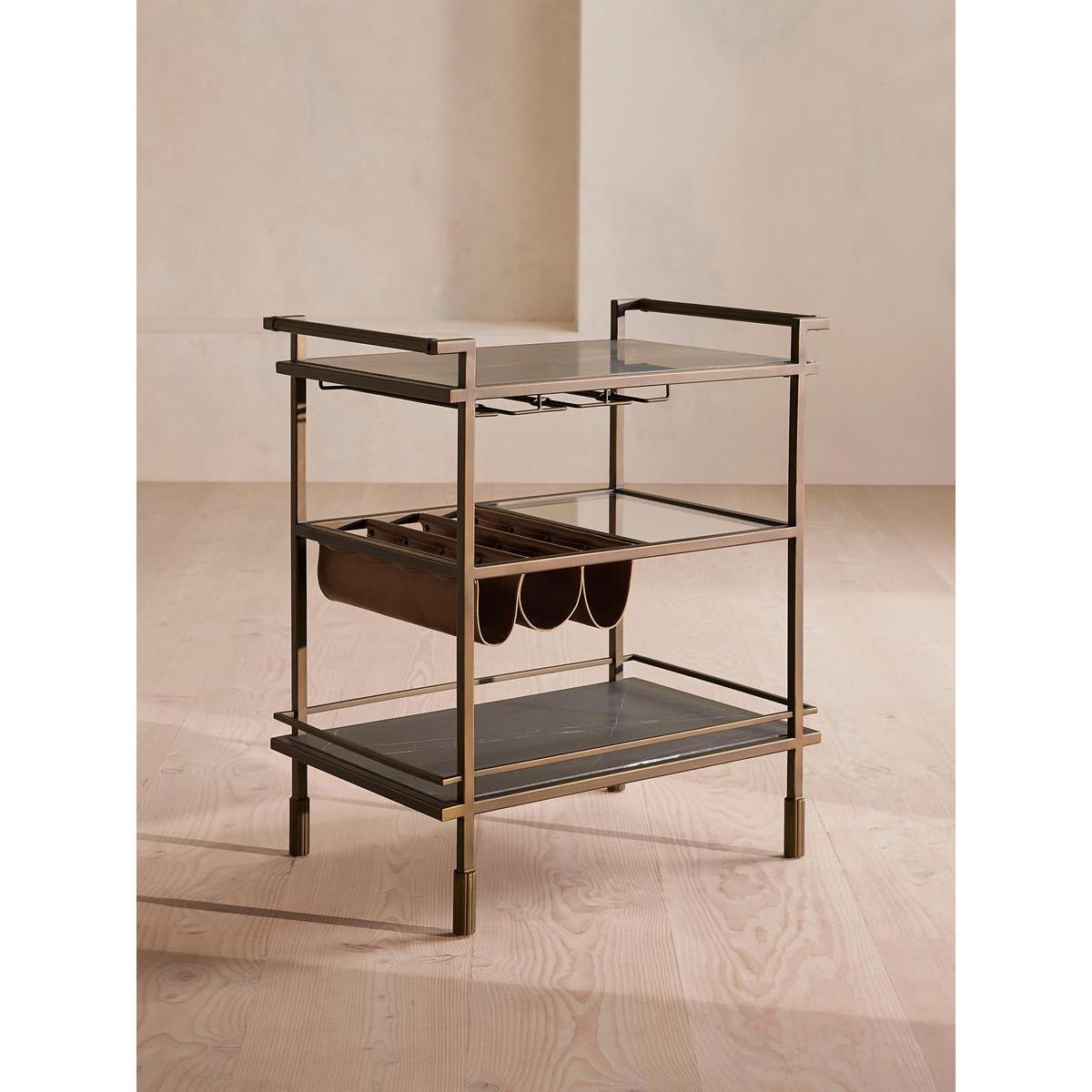 The Portnall bar cart echoes the textures seen at White City House. A blackened brass metal finish contrasts the Spanish black Marquina marble shelves, while a clear glass middle shelf is great for displaying everything from glassware to bar utensils and recipe books. Fitted with an adjustable wine rack, the bar cart features three leather slings - ideal for storing your favourite wine and spirits.