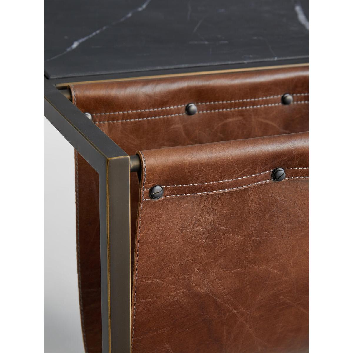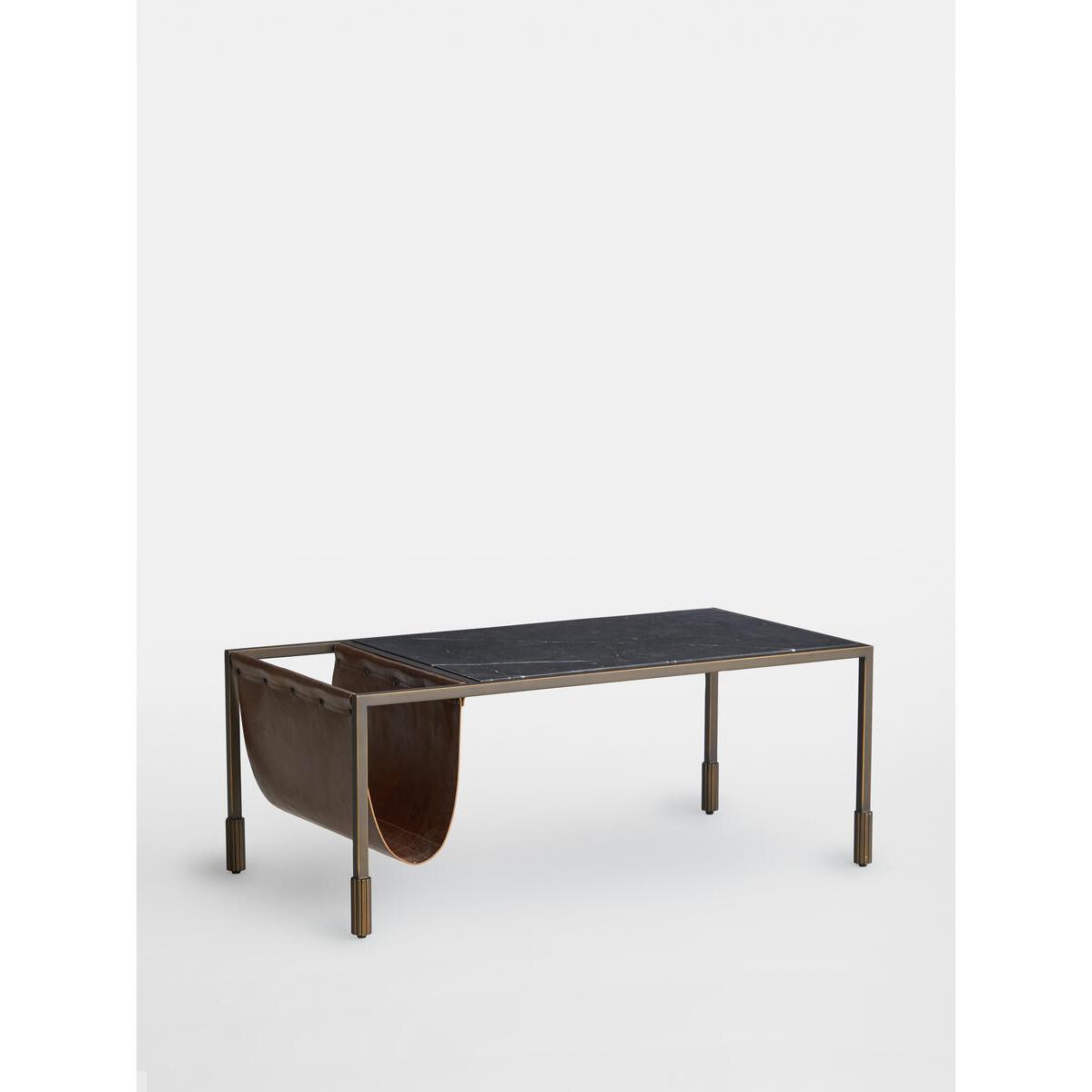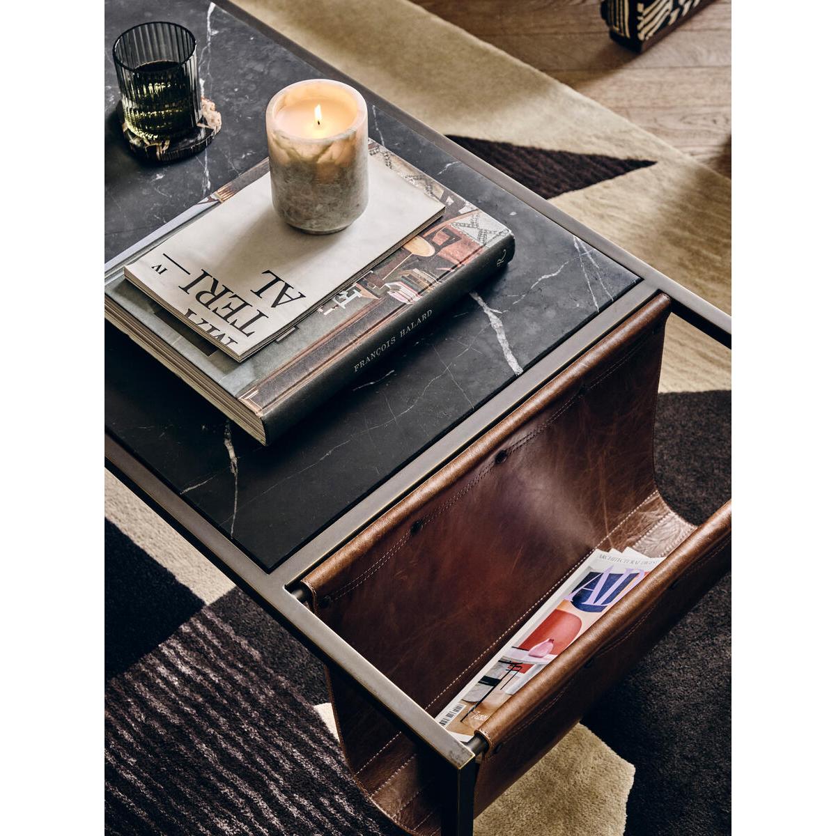 Drawing inspiration from the furniture in Soho House Tel Aviv,our Portnall coffee table is built on a blackened-brass frame, withblack honed-marble top and distressed-leather sling adding anunexpected twist. Blackened-brass frame. Black honed-marble top. Distressed-leather sling. Variations in the marble make each piece unique. Inspired by Soho House Tel Aviv.