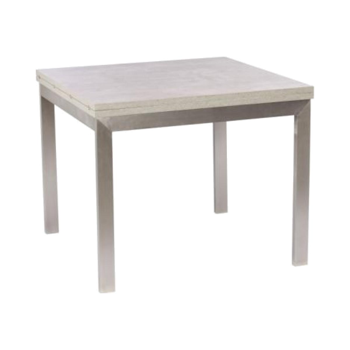 Simplistic style and practical design creates a stunning industrial look. Walnut veneers and brushed stainless steel teamed with the distinctive look of concrete. Simply flip the top on this dining table to increase the table length from 90cm to 180cm. When extended you'll be able to accommodate 6 diners easily making this table great for those who like to entertain from time to time, but have limited space for the table to remain fully expanded all of the time as it folds down to a nice compact 90cm square table for everyday use. Dimensions - 75cm H x 90cm W x 90cm D Table extends to 108cm in Width as and when required by simply flipping the top Concrete look table top