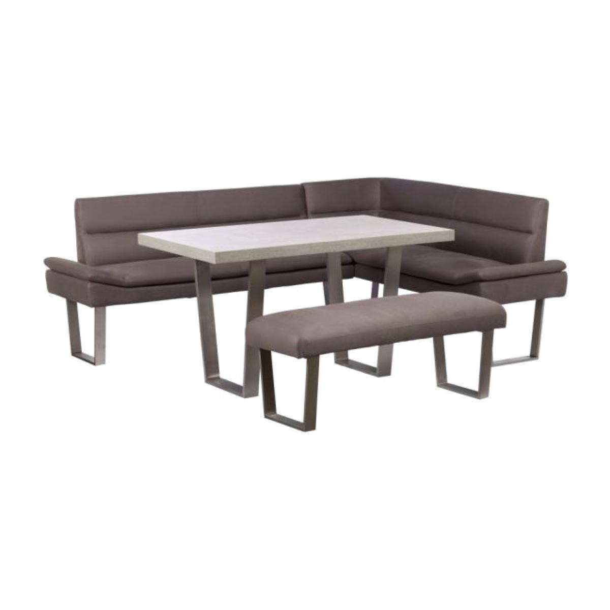 Simplistic style and practical design creates a stunning industrial look. Brushed stainless steel legs with a gorgeous fabric upholstery dress up your everyday dining table into something that little bit special. If your eating space is part of your main living space then this dressed up solution is great for you! Supplied as a complete corner sofa (table and bench shown are not included in this price), this corner sofa is also available in right hand configuration to suit your space.  Dimensions - 84cm H x 228cm W x 178cm D. Porto table and bench sold separately and not included.   Dark grey faux suede fabric