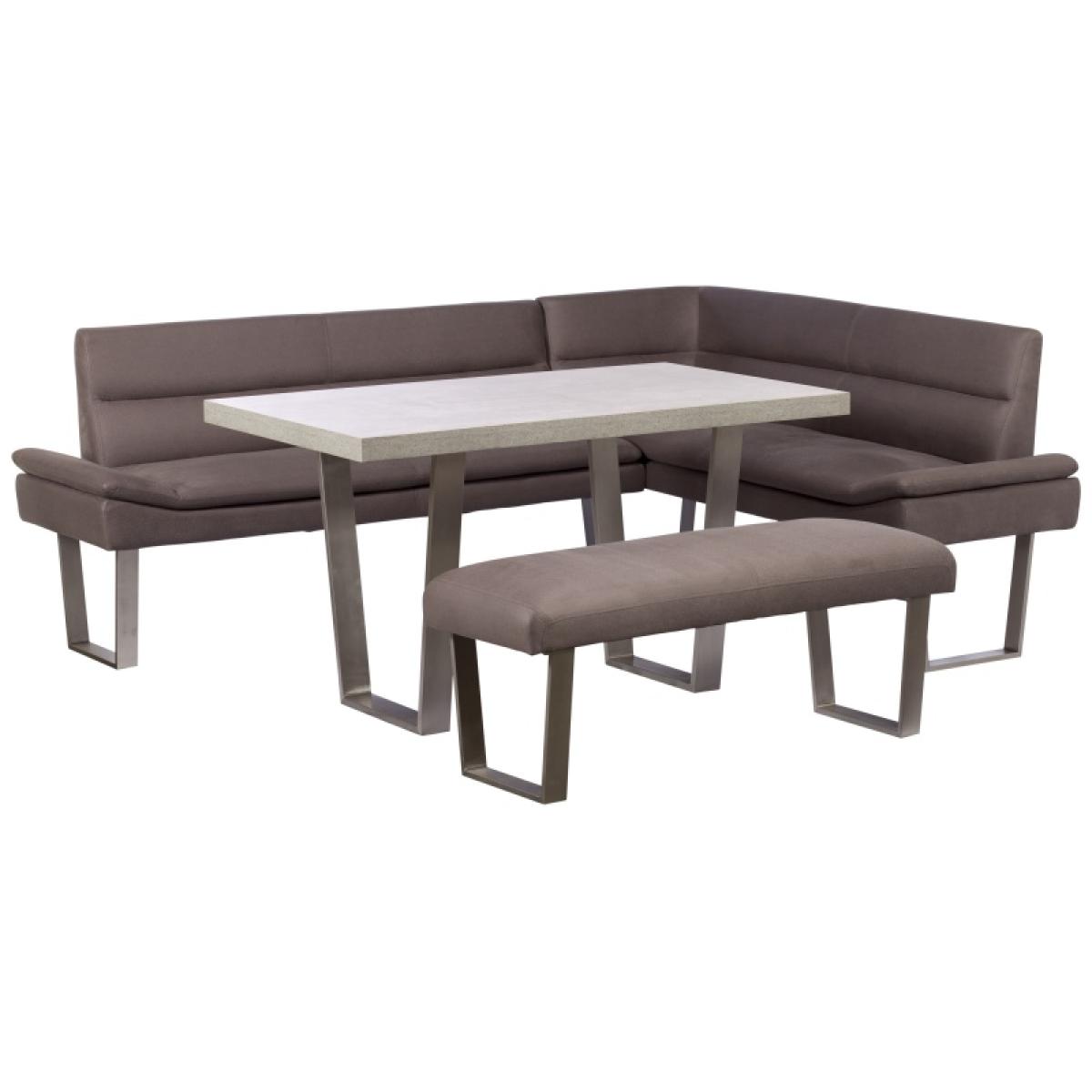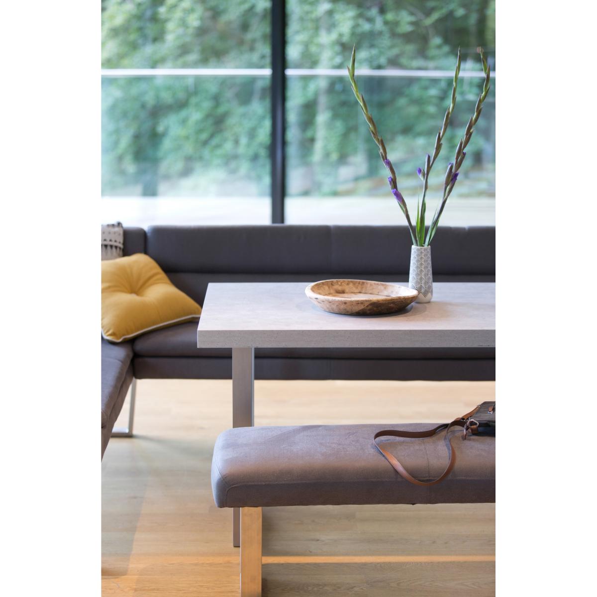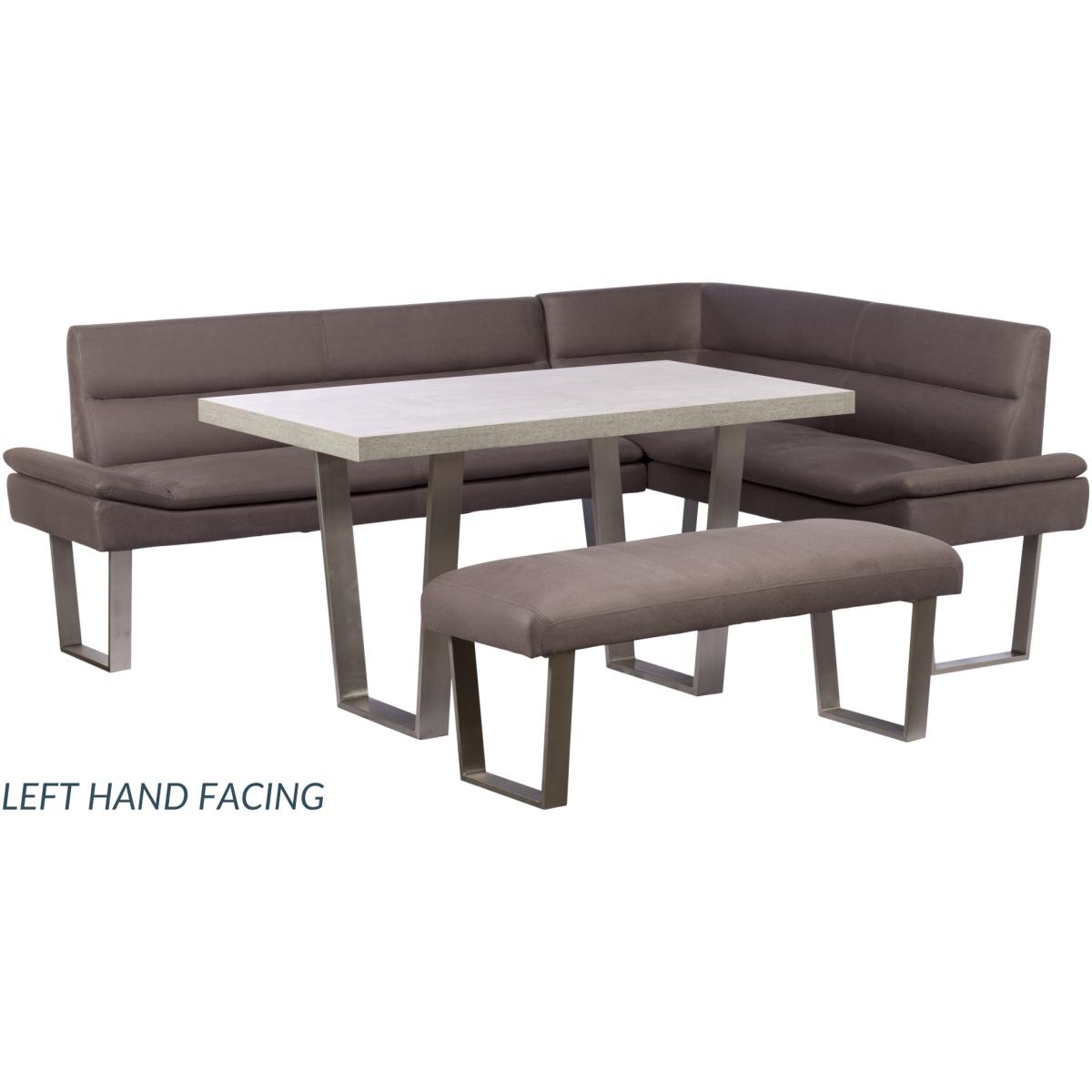 Please note, the first image shows the Porto dining corner group in the right hand facing configuration. This corner group will come as left hand facing. The Porto dining corner group boasts simplistic style and a practical design which work to create a stunning industrial look, perfect for a contemporary home. A brushed stainless steel frame is teamed with the distinctive look of a faux concrete tabletop and suede effect upholstered benches. This on-trend corner dining group consists of a corner sofa, bench and 135cm dining table. Please note, this product requires home assembly. DIMENSIONS: Corner Sofa:H 84cm x W 228cm x D 178cm. Bench:H 48cm x W 120cm x D 45cm. Table:H 76cm x W 135cm x D 80cm. All screens vary in colour reproduction and whilst every effort has been made to display the colour as accurately as possible it is for guidance only.