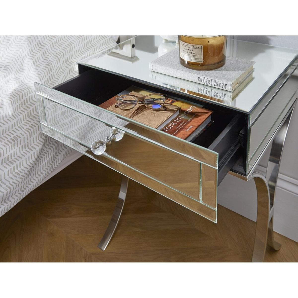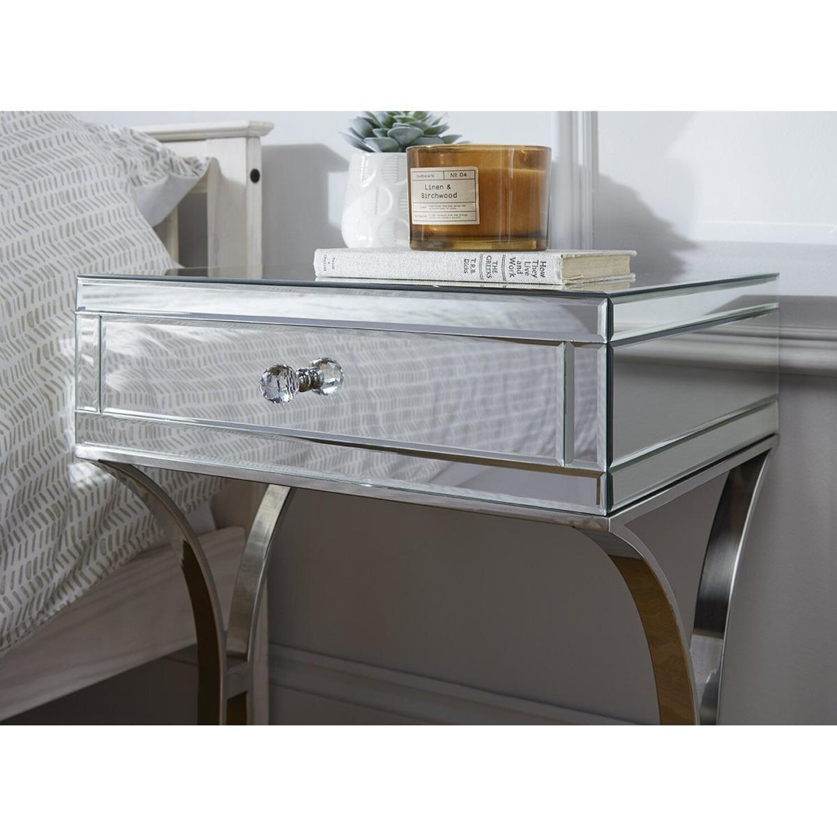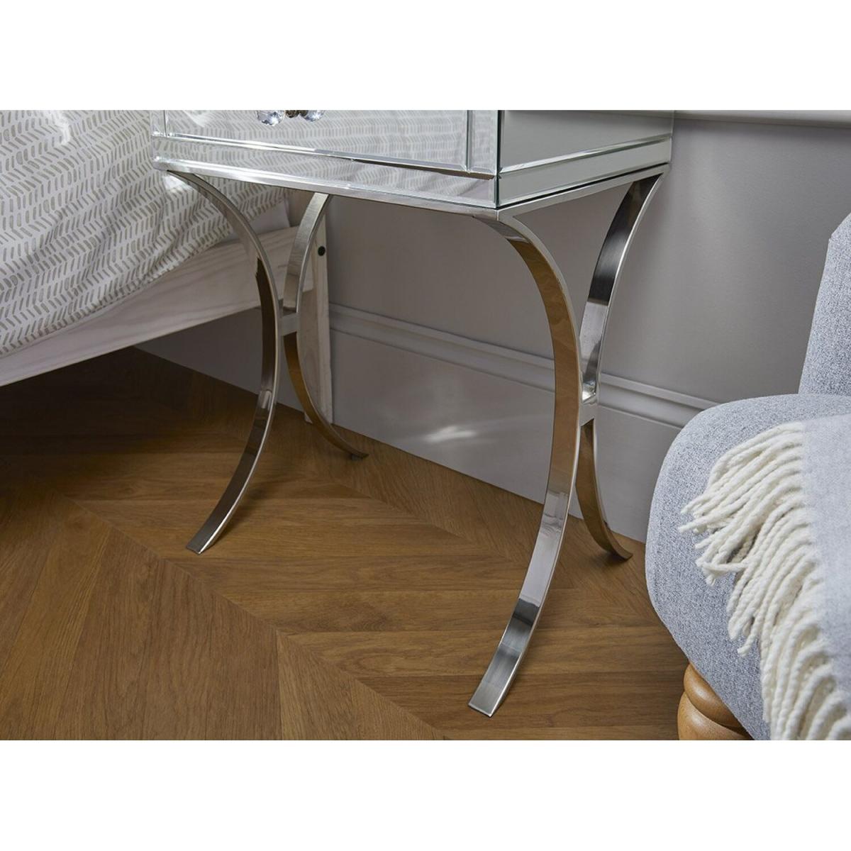 Providing valuable storage and classic elegance, the Porto Mirrored Bedside Tables are the perfect partner for any bedroom space. With stunning curved chrome legs and a single drawer per unit, these sophisticated pieces are the perfect match for any stylish bedroom looking for a timeless classic.