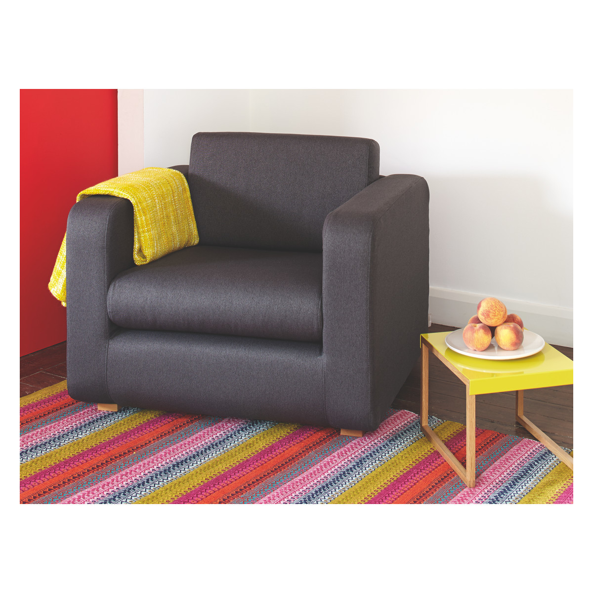I love this armchair for its bold saffron yellow hue, which can instantly brighten up a neutral or minimal space. Its wooden feet add a touch of warmth and a natural element, making it versatile for both contemporary and Scandinavian-inspired interiors. It works particularly well in living rooms where you want a statement piece, or even in a bedroom corner as a quirky seating option. For styling tips, pair it with soft grey or navy cushions and a textured throw for added comfort, or mix it with other colourful accessories for a playful, eclectic look. Its compact form also makes it practical for smaller spaces, providing a pop of colour without overpowering the room.