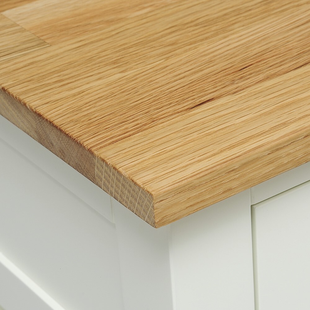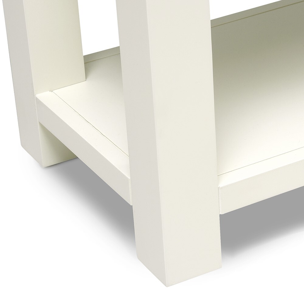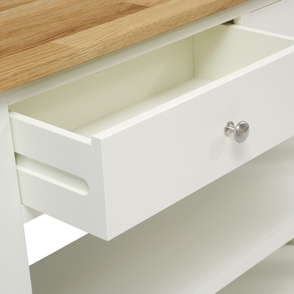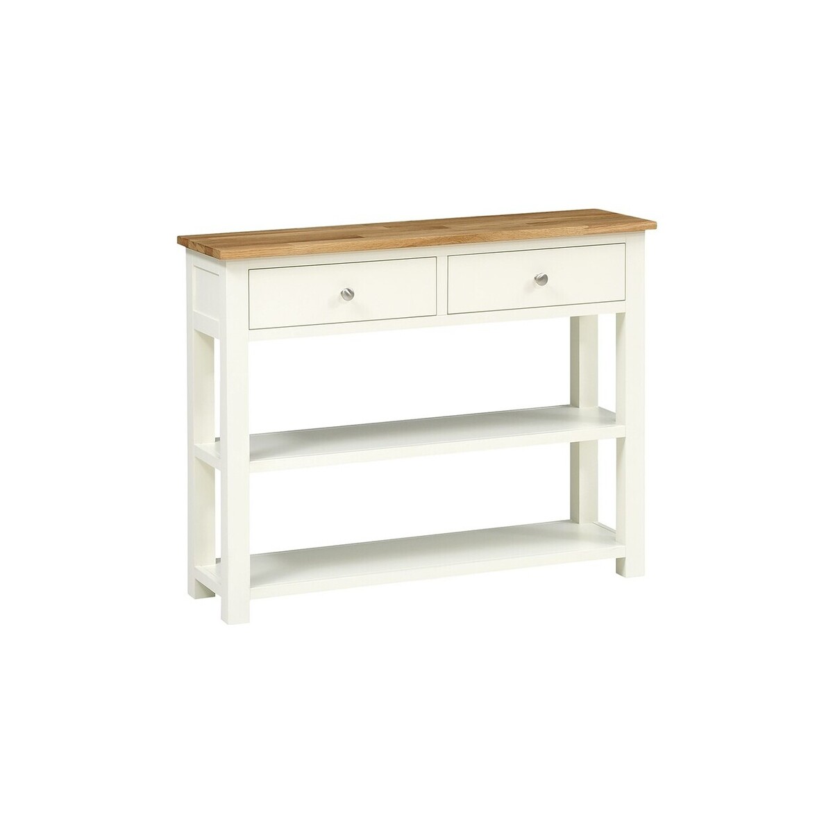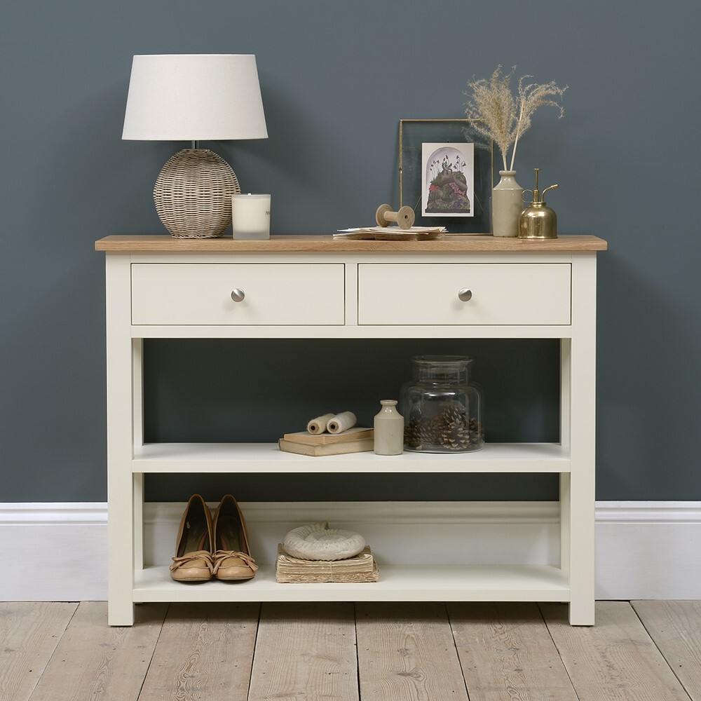 The perfect finishing touch to your hallway or indeed any room in your home. this charming shelved console table offers a wealth of open storage with two drawers to keep keys, notepads or other out-the-door items close at hand. Painted in a soft ivory it has a contrasting finger jointed top which has been lightly oiled to bring out the brilliance of the wood grain.