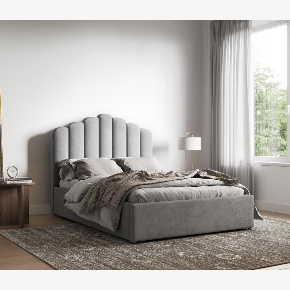 Poseidon is a glamorous art deco style bed frame. The glamourous shell headboard is expertly upholstered in a beautiful velour velvet. The modernised art deco design will bring any drab interior to life. Along with style comes practicality, the poseidon hides an enormous underbed storage space, great for storing bedding and other accessories. An end lift ottoman makes for effortless storage access. Available in Navy blue and Silver Velvet, two spirited colours that really pop. The Poseidon gas lift ottoman comes in both a double and king size option. Accompanied by a sprung slatted base that reduces the strain on you and your mattress.