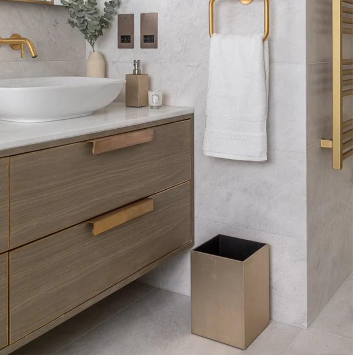 I love this bin because its champagne finish instantly elevates any space, adding a touch of understated luxury. Its simple, clean lines make it versatile enough to work well in both contemporary and classic interiors-from sleek kitchens and bathrooms to stylish offices. Practical styling tips include pairing it with other metallic elements for a cohesive look or placing it alongside neutral-toned accessories to highlight its sheen. For a polished, curated feel, it can be nestled among soft textiles or minimalist décor, while its understated elegance ensures it remains functional without dominating the room.