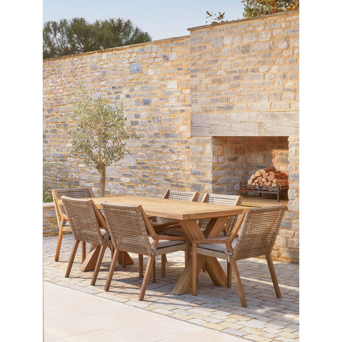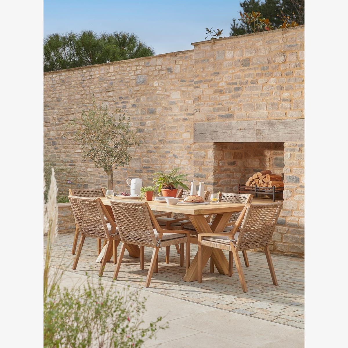 A bold and substantial outdoor table which wouldn’t look out of place surrounded by extended family on a Tuscan hillside. With plenty room for friends and family, the table offers sociable outdoor dining space married with attractive styling such as neat crossed legs and a sturdy plank top. Made of hard wearing acacia wood, this versatile piece will team with most seating types but it looks particularly good with our. Amalfi Dining Chairs. Browse our useful Outdoor Furniture Buying Guide.