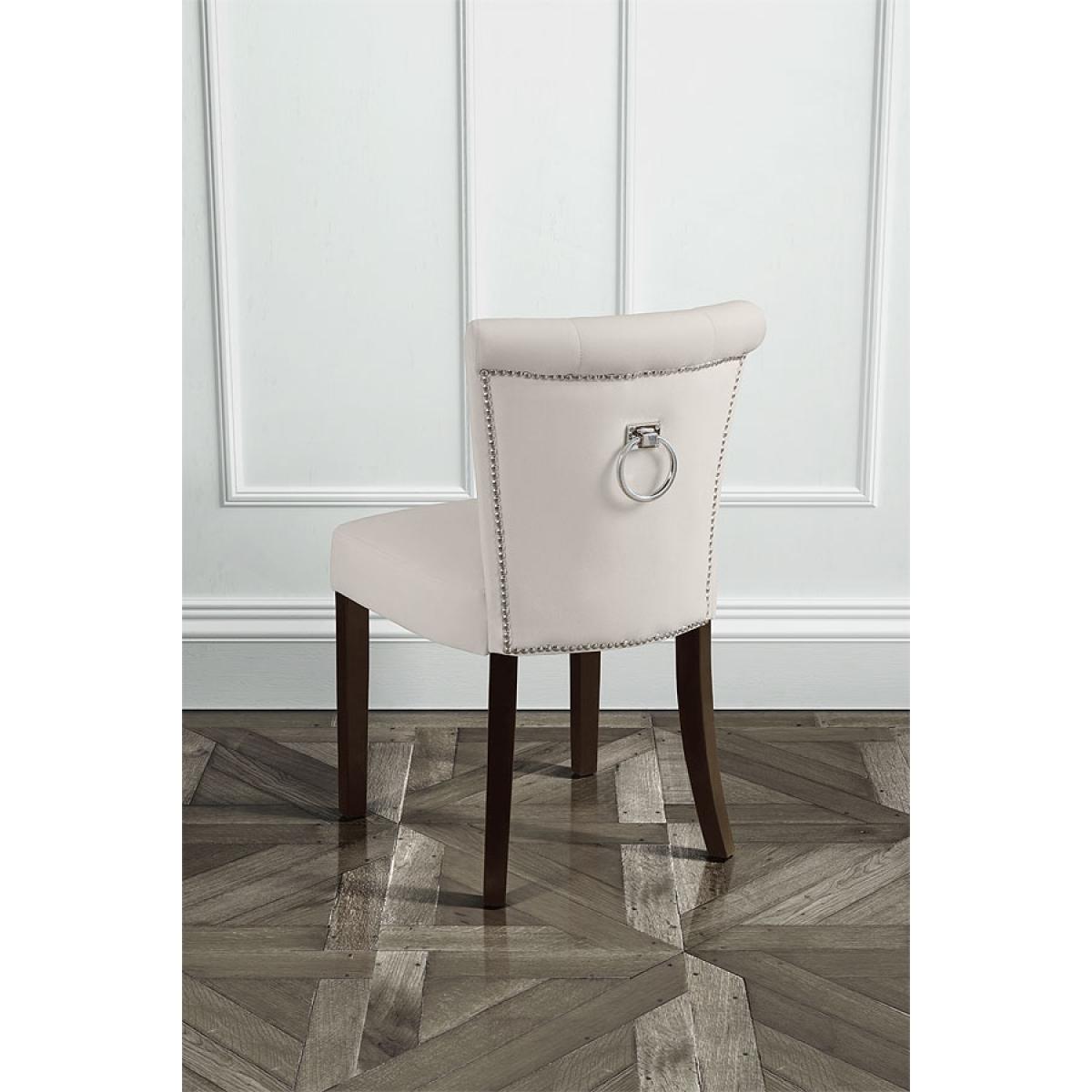A magnificent, statement dining chair that will add a sophisticated, elegant touch to your interior. Luxurious cream velvet fabric. Features chrome handle. Handsome chrome upholstery tacks. Walnutcolor legs. Requires part assembly. This chair can be re-upholstered to a colour of your choice for an additional cost, ask us for a free swatch and a quotation.