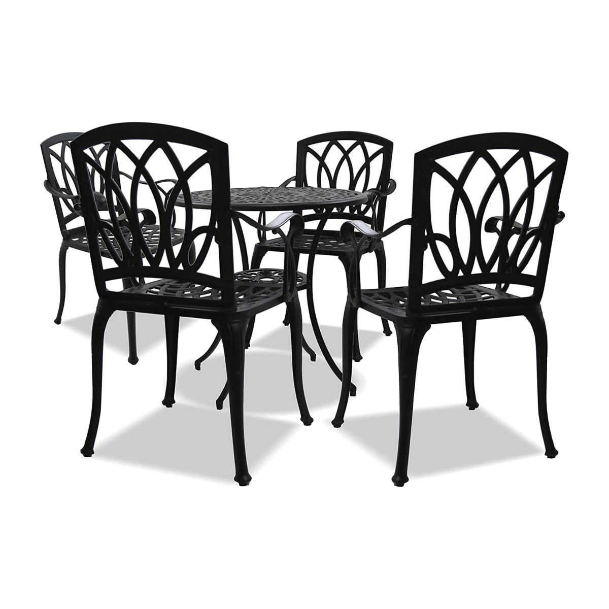 With its luxurious design the Positano bistro set is practical, convenient and perfect for any garden, patio, terrace, decking, balcony, lawn, yard or similar areas, and adds a touch of class wherever it sits. The Positano is a 5-piece bistro set featuring 4-high backed large chairs with armrests and a matching table. It promotes a highly decorative Italian influenced design, with patterned chairs, detailed table top, and stylish legs. The table comes complete with a central hole for the placement of an umbrella or parasol with a diameter of 4.0cm. Made from no-rust cast aluminium, the Positano outdoor bistro set is strong yet lighter and easier to move than the traditional cast iron predecessor. It is low maintenance and easy to keep clean, it has been powder coated for durability and comes complete with rubber pads for steadiness. With durability in mind, the hardwearing Positano garden bistro set is designed to be left outside all year and be resistant to most types of extreme weather. Its long life span means it will not need replacing every few years like wood, plastic and other materials, and will not rot or rust. The Positano metal garden furniture comes flat-packed with simple and easy-to-follow home assembly instructions. Each Chair measures as follows: Width: 52cm x Depth: 51cm x Height: 92cm / Weight capacity: 130kg. The Table measures as follows: Diameter: 69cm x Height: 70.0cm / Parasol Diameter: 4.0cm / Weight Capacity: 50kg. The Positano set comes complete with a 1-Year Manufacturers Warranty Included.