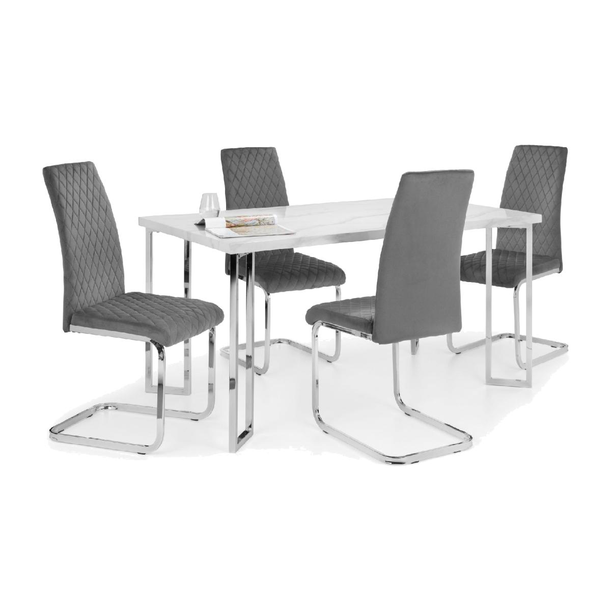 I really like the Positno set with the four Calabria chairs because of its modern, understated style. The grey upholstery offers versatility, working well in both contemporary and minimalistic interiors, but it can also ground a more eclectic or Scandinavian look. For styling tips, consider adding colourful or textured place settings to add personality, or layer with a statement rug underneath to create a cosy feel. The slim metal legs give the table a light, airy appearance, so it works well in smaller dining areas or open-plan spaces where maintaining a sense of space is important. Overall, it’s a practical and adaptable choice for those wanting a sleek dining setup that can blend into a variety of interiors.