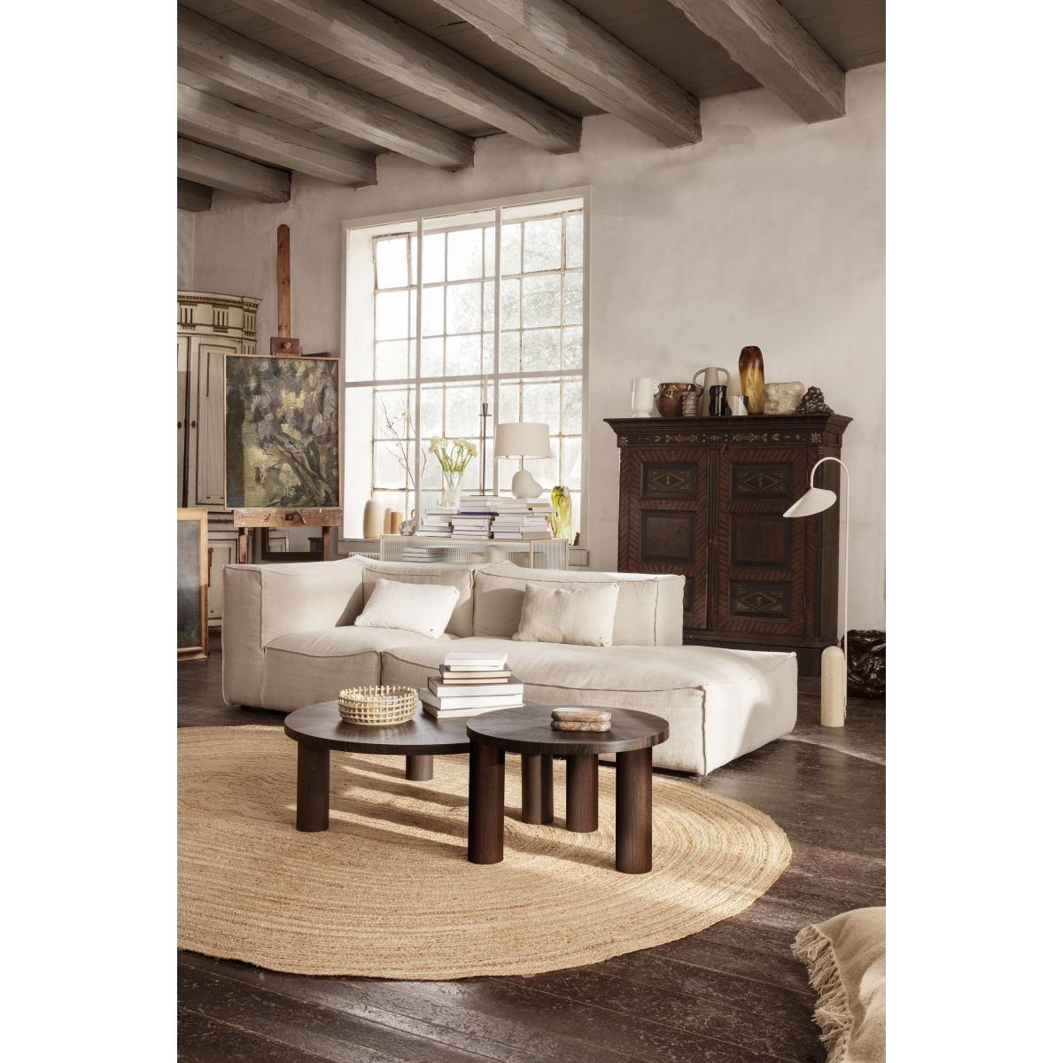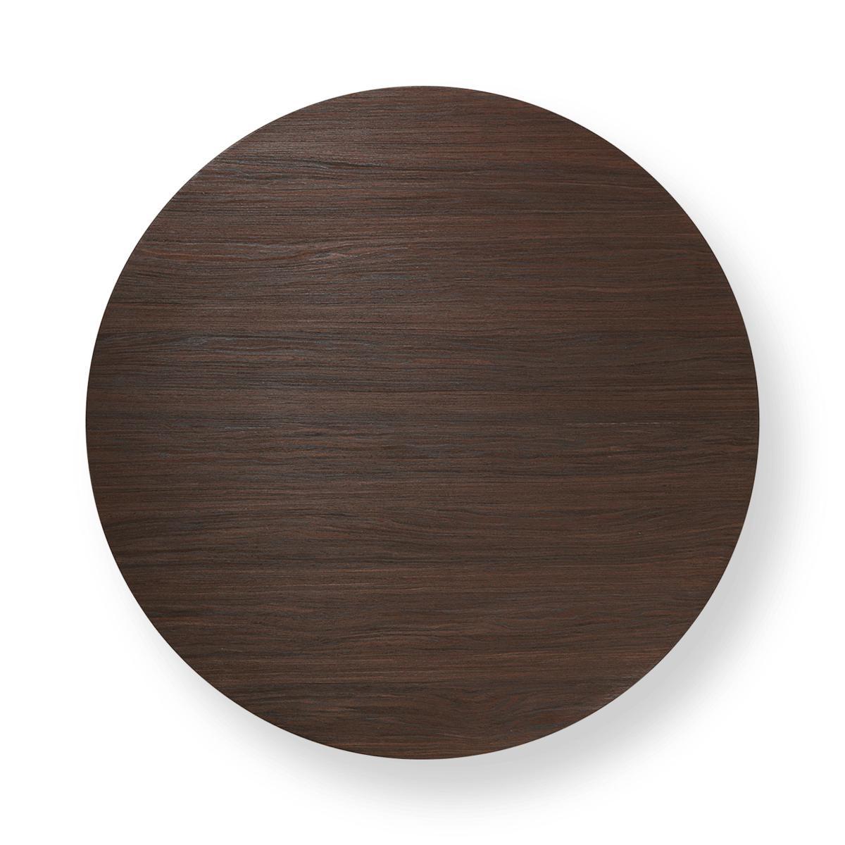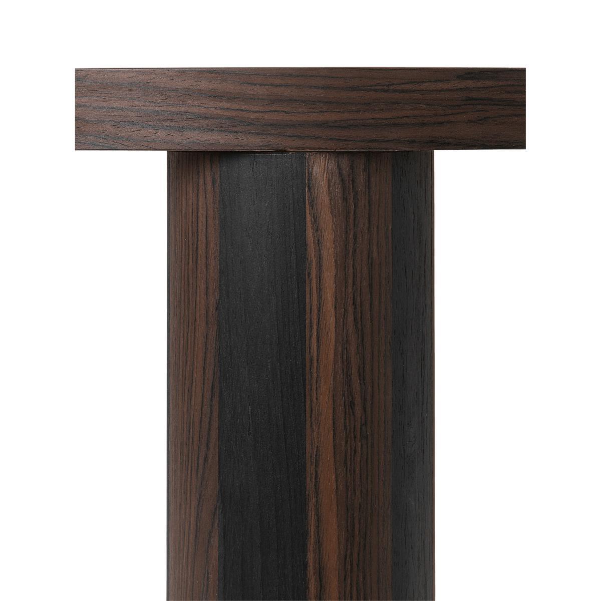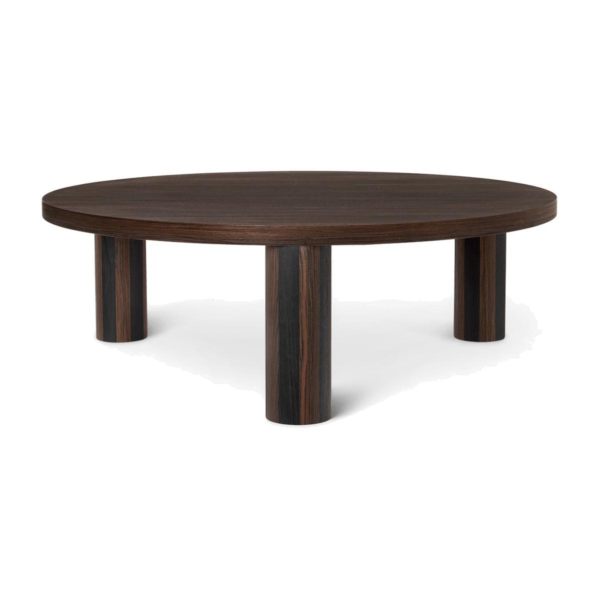 Inspired by brutalism, the Post coffee table offers a set of imposing, balanced volumes. It displays generous, simple, solid lines, embellished with expressive marquetry details. The thick top sits above three broad cylindrical legs that resemble sturdy wooden logs. The Post coffee table is a very contemporary interpretation of the traditional technique of marquetry. It’s made entirely of FSC-certified smoked oak veneer on an MDF core. The legs have a hand-made marquetry decoration, made of a collage of wood in two different colours (smoked oak and black). This geometric, contrasting striped pattern has a strong character. The Post table is the result of a search for balance between graphics, materials and a passion for craftsmanship.