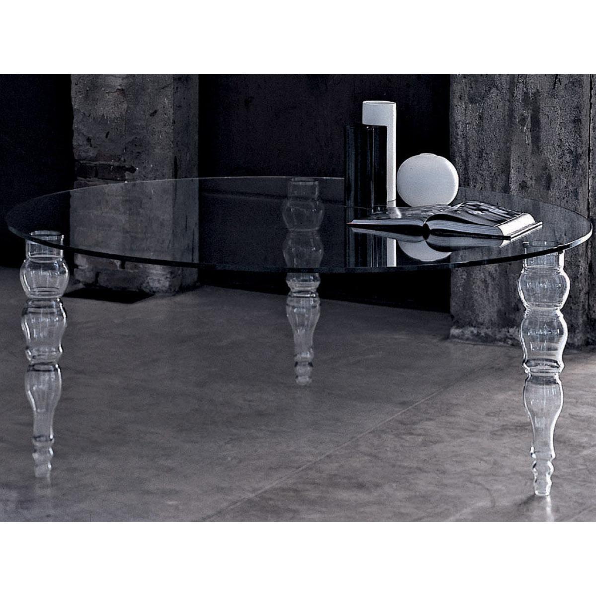 Totally transparent, this table combines purety and simplicity with sophisticated and baroque legs. A superb blend of styles ! Forms from the past are interpreted with the modernity of the glass. Sublime ! '' Post modern'' exists in high and low table and with diffrent forms of top (rectangular, square and round).