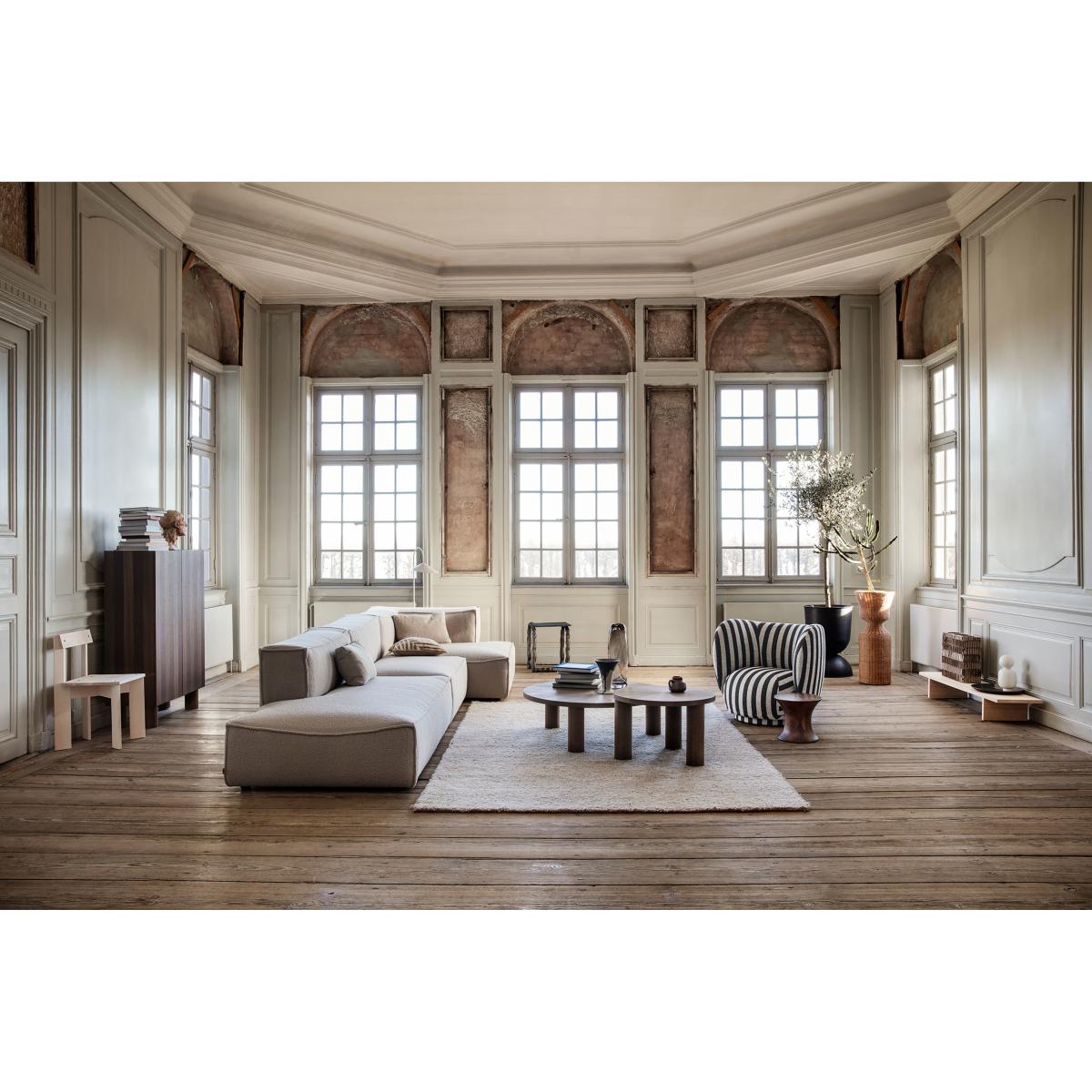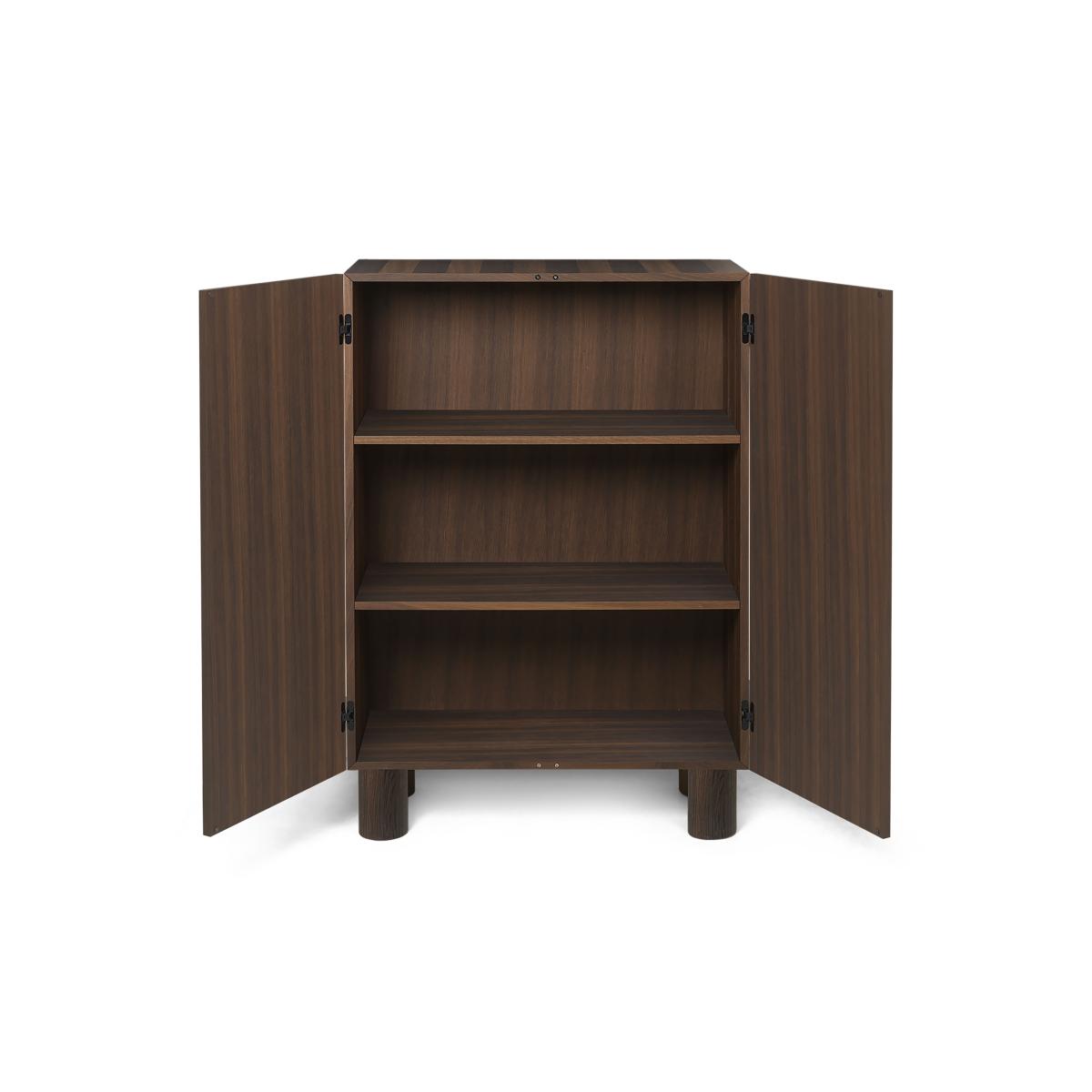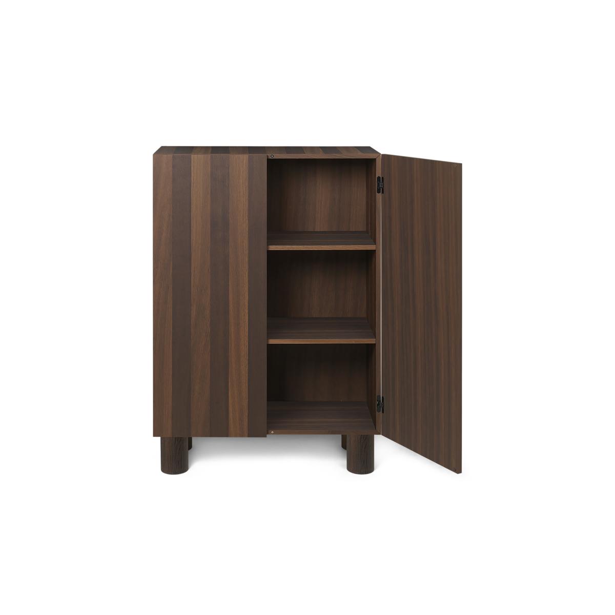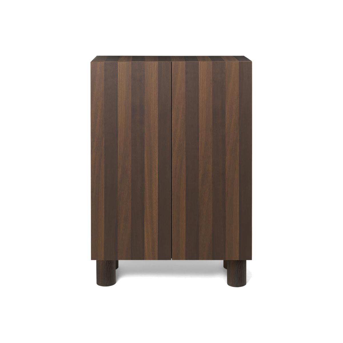 Inspired by brutalism, the Post storage unit offers a set of imposing, balanced volumes. It displays generous, simple, solid lines, embellished with expressive marquetry details. This furniture piece thrones over four broad cylindrical legs that resemble sturdy wooden logs. The Post storage unit is a very contemporary interpretation of the traditional technique of marquetry. It boasts hand-crafted marquetry decoration, composed of a collage of two tones of wood (light and dark smoked oak). This striped, geometric, contrasting pattern has a strong character. Preserving the simple feel of the striped front, the doors of the cupboard open and close via a hidden mechanism (push to open) to avoid visible handles. The Post collection is the result of a search for balance between graphics, materials and a passion for craftsmanship.