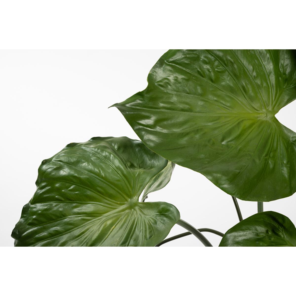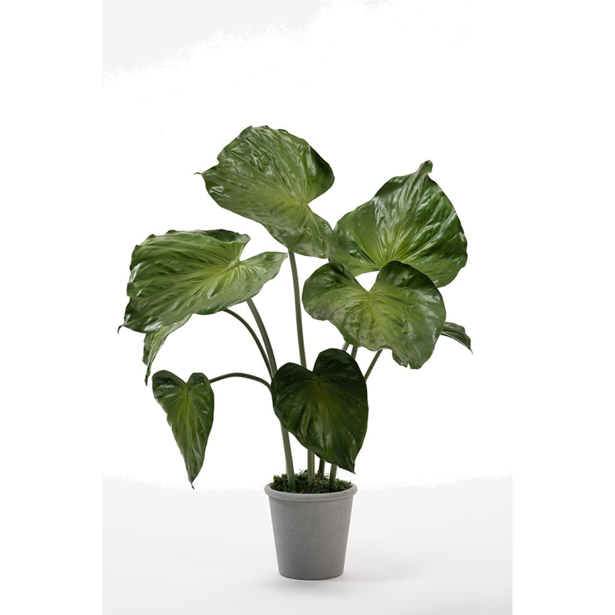 Medium-large sized artificial Elephants Ear Plant. Realistic-looking high-quality reproduction. Supplied securely fixed into a grey plastic plant pot. Leaves can be easily repositioned as desired.