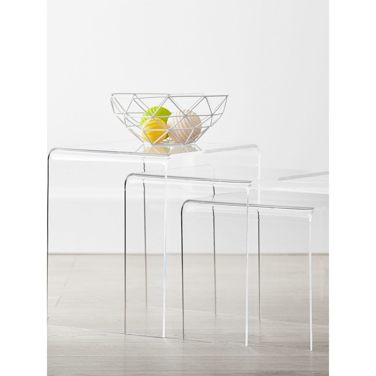 These place-anywhere nesting tables boast chic, transparent style that adds modern design to your baby's room. Crafted with curved sides, they offer smart storage without cluttering up space.
