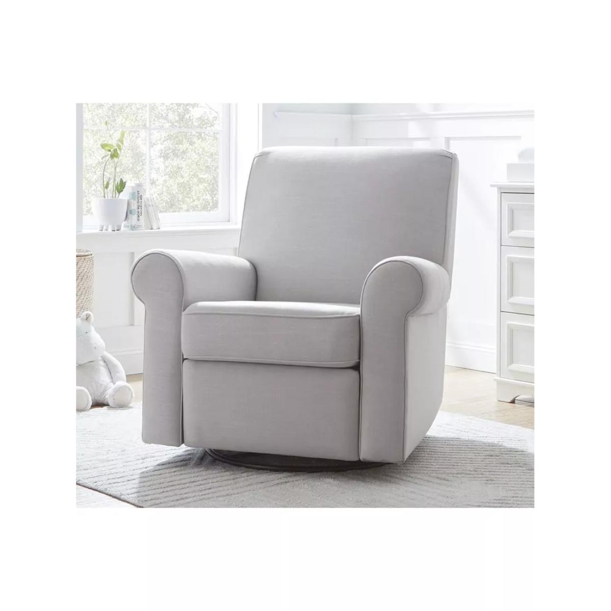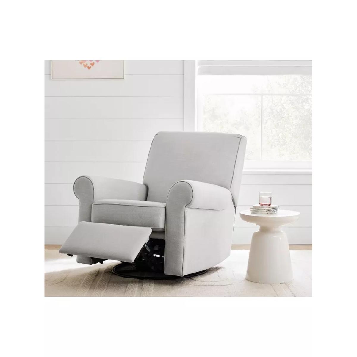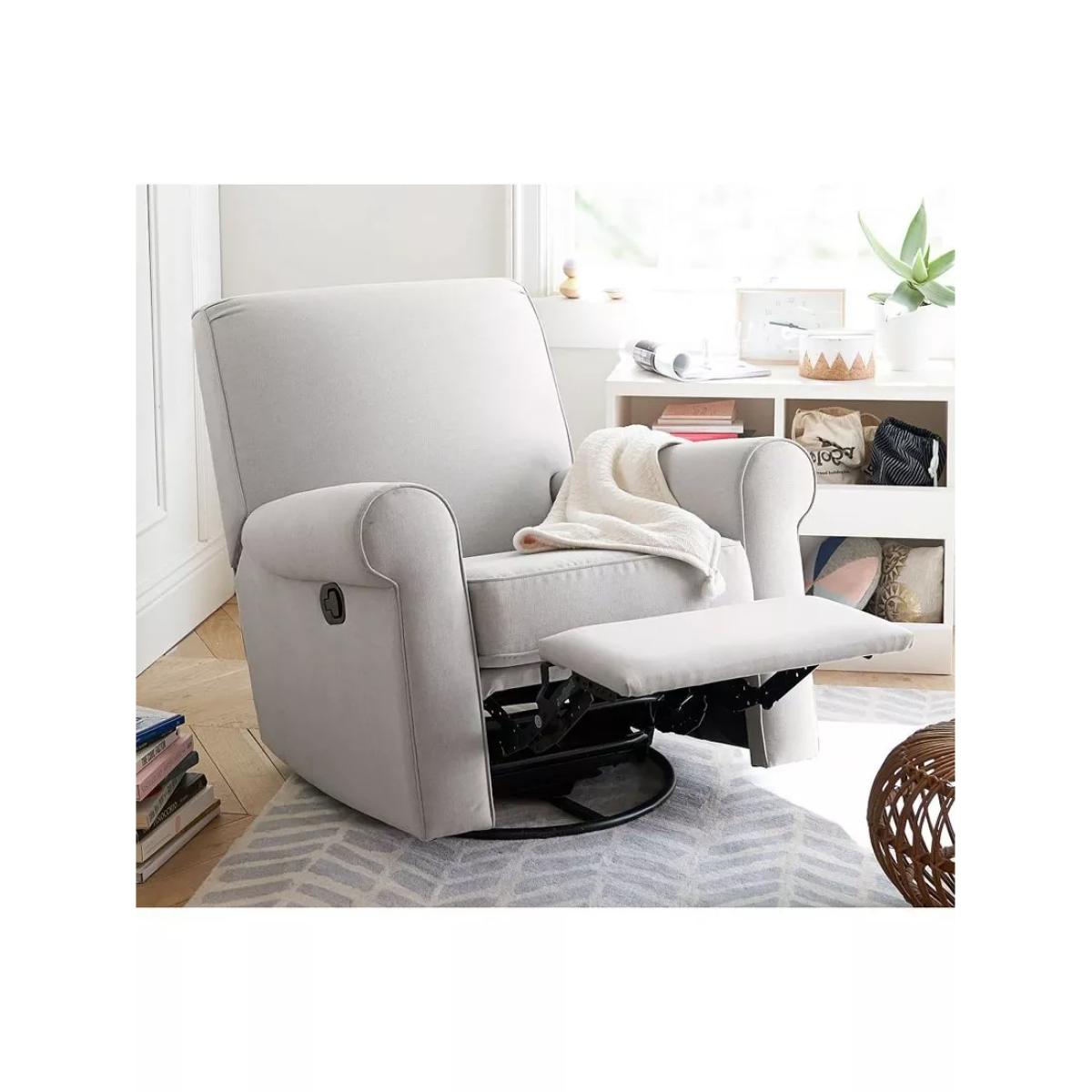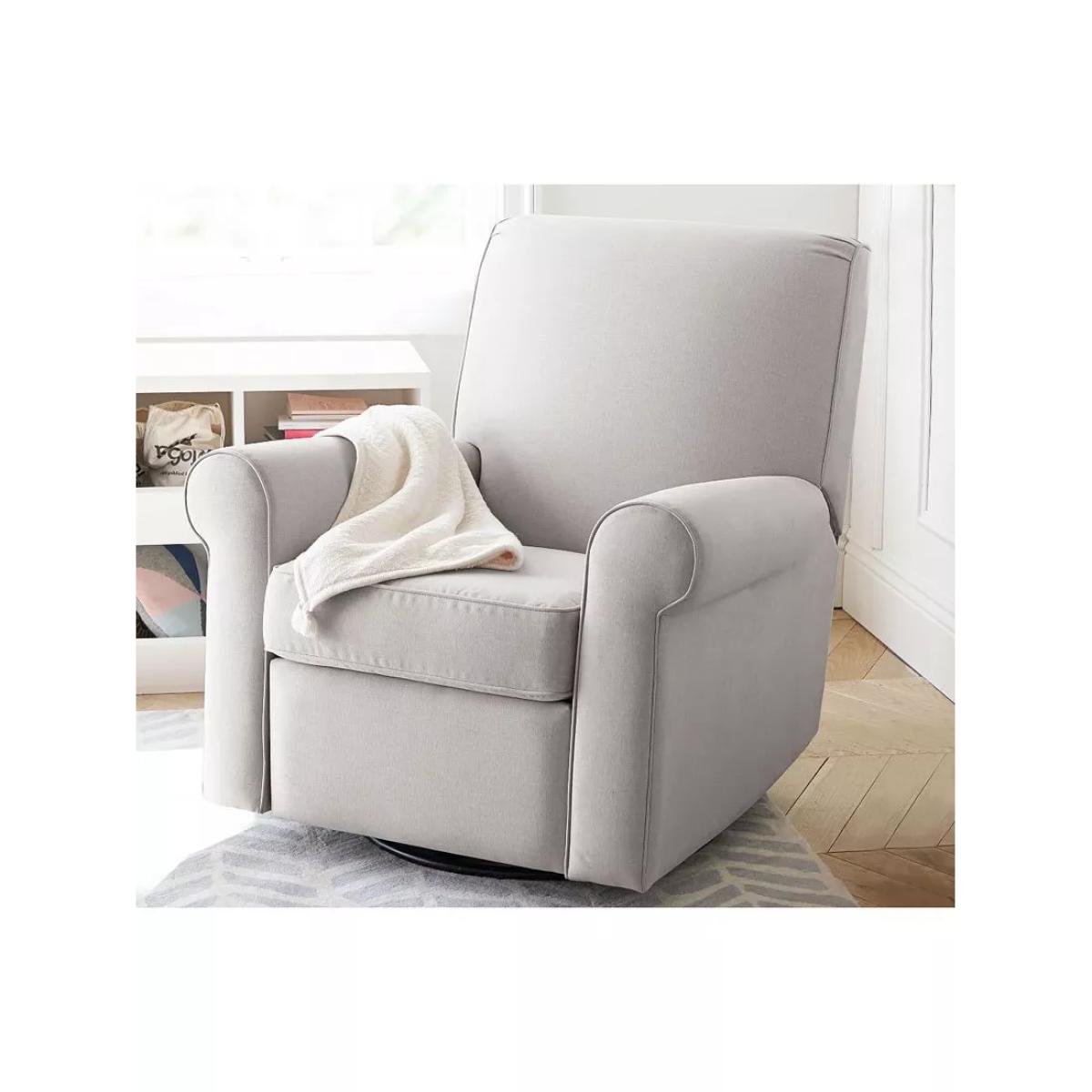 Designed with firm, supportive cushions, this rocker chair swivels and manually reclines in three different positions so you can feed and snuggle with baby. Chair swivels 240 degrees, glides back and forth and manually reclines Chair has 3 recline positions: sitting, reading and full recline Manual recliner mechanism is designed to be easily used while holding your baby Once the Charleston Recliner is reclined, it will be stationary and will not move Frame is expertly crafted plywood and pine wood Round arms Polyester-wrapped, flame-retardant-free cushions for a firmer feel All wood is kiln-dried, a process that ensures that the furniture will never split, warp, crack or mildew No-sag steel sinuous springs provide cushion support To prevent injury, chair should be placed on a flat, even surface while in use GREENGUARD Gold Certified to contribute to healthier indoor air, keeping you and your family safer All Pottery Barn kids products are tested at third-party CPSC-accredited labs to meet or exceed all industry voluntary and regulatory safety requirements.