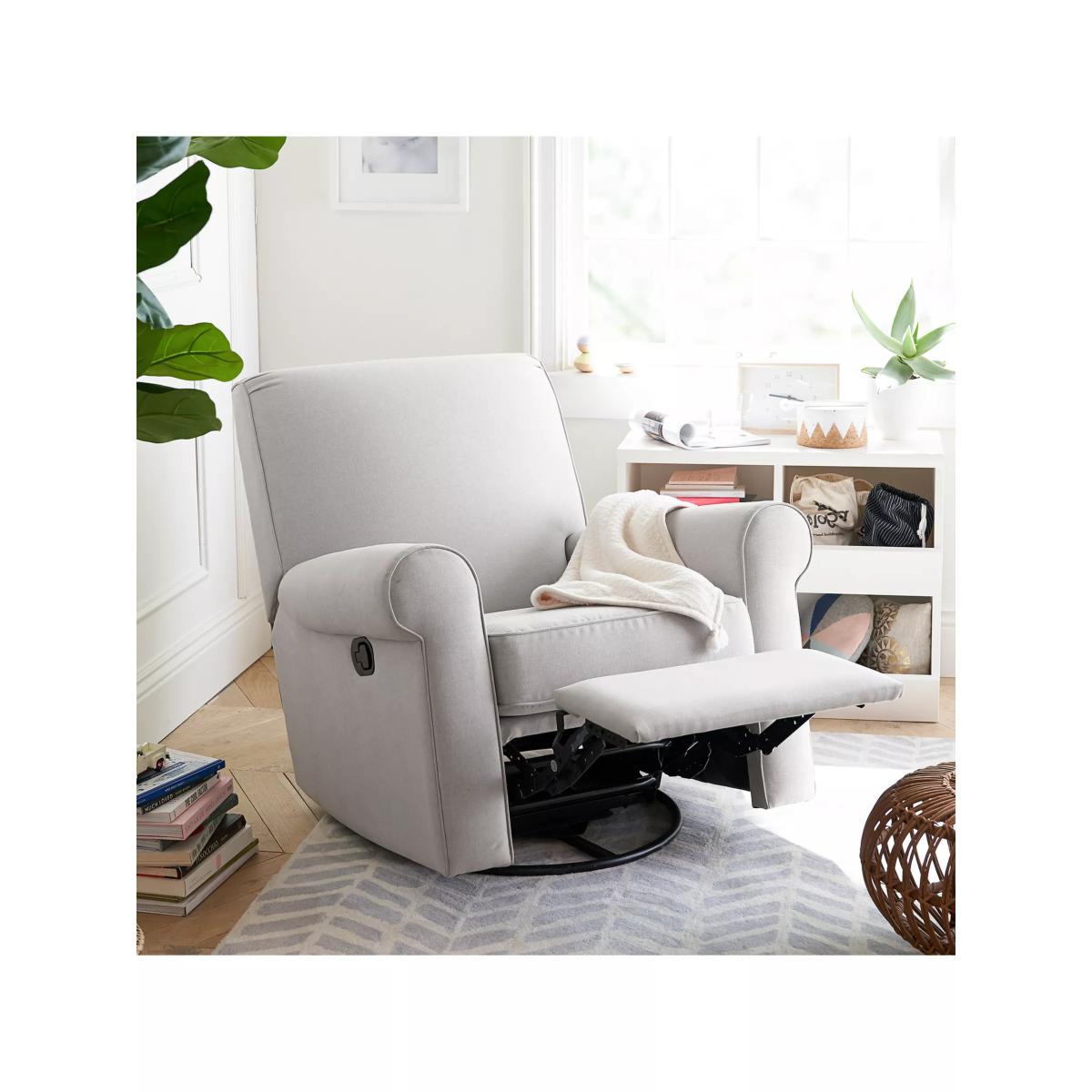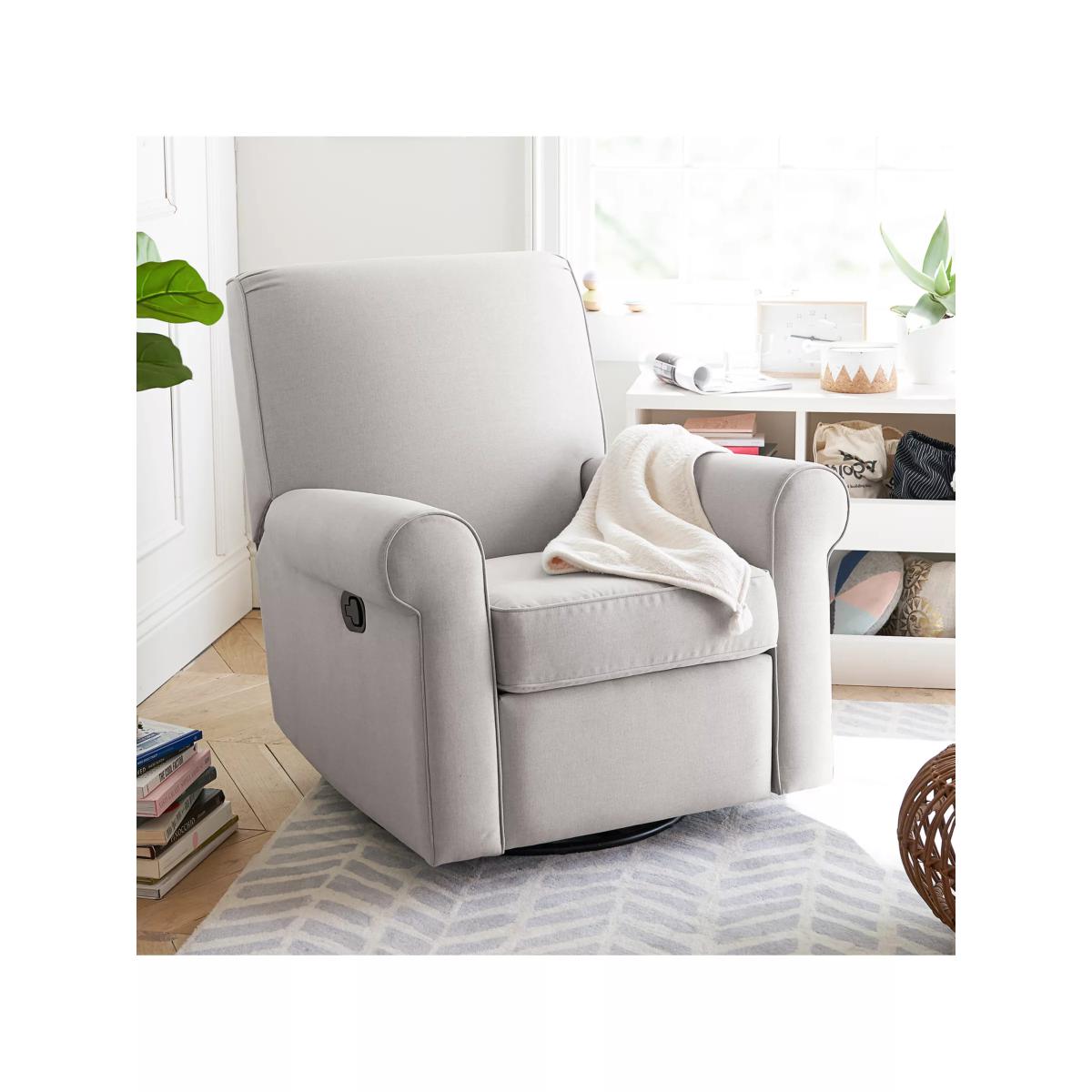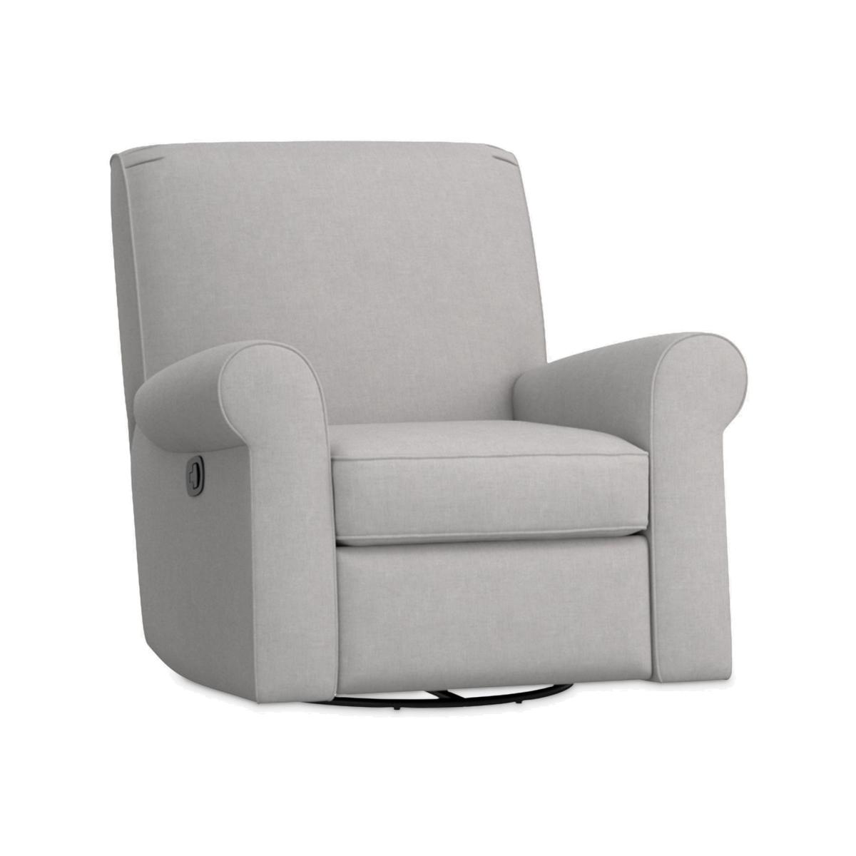 Enjoy the classic style and soothing comfort of this Pottery Barn Charleston nursery seating on a scale that's perfect for smaller nurseries. Plush, firm cushions offer nestling comfort, while the seat swivels and manually reclines in three different positions so you can feed and snuggle with your little one. Masterfully designed for exceptional comfort, the chair has extra depth and a double layer of padding. Once the Charleston recliner is reclined, it will be stationary and will not move or swivel. The recliner mechanism is designed to be virtually silent and can be easily used while holding your baby. The integrated swivel base provides optimal motion control. Key features: Polyester-wrapped, flame-retardant-free cushions for a firmer feel Durable and built to last with a solid hardwood frame No-sag sinuous springs provide cushion support GREENGUARD Gold Certified. Meets or exceeds stringent chemical emissions standards Dimensions: Seat: 50 cm wide x 48 cm deep x 51 cm high Arms: 15 cm wide x 62 cm deep x 65 cm (floor to top of arm) Recliner base: 61 cm long x 8 cm high