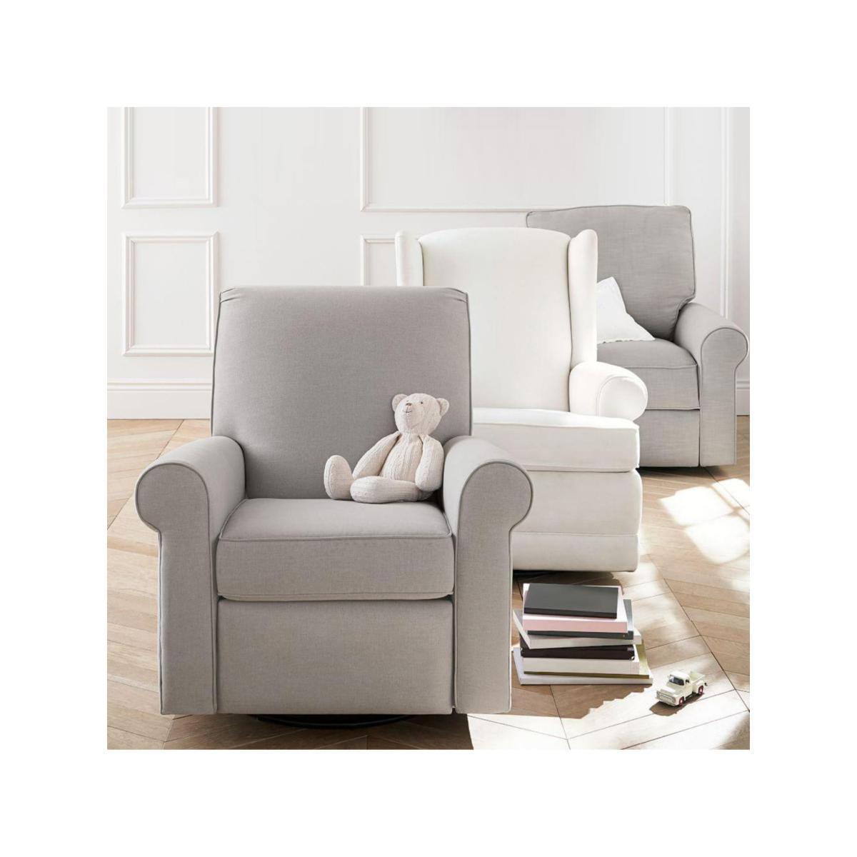 Enjoy the classic style and soothing comfort of this Pottery Barn Charleston nursery seating on a scale that's perfect for smaller nurseries. Plush, firm cushions offer nestling comfort, while the seat swivels and manually reclines in three different positions so you can feed and snuggle with your little one. Masterfully designed for exceptional comfort, the chair has extra depth and a double layer of padding. Once the Charleston recliner is reclined, it will be stationary and will not move or swivel. The recliner mechanism is designed to be virtually silent and can be easily used while holding your baby. The integrated swivel base provides optimal motion control. Key features: Polyester-wrapped, flame-retardant-free cushions for a firmer feel Durable and built to last with a solid hardwood frame No-sag sinuous springs provide cushion support GREENGUARD Gold Certified. Meets or exceeds stringent chemical emissions standards Dimensions: Seat: 50 cm wide x 48 cm deep x 51 cm high Arms: 15 cm wide x 62 cm deep x 65 cm (floor to top of arm) Recliner base: 61 cm long x 8 cm high