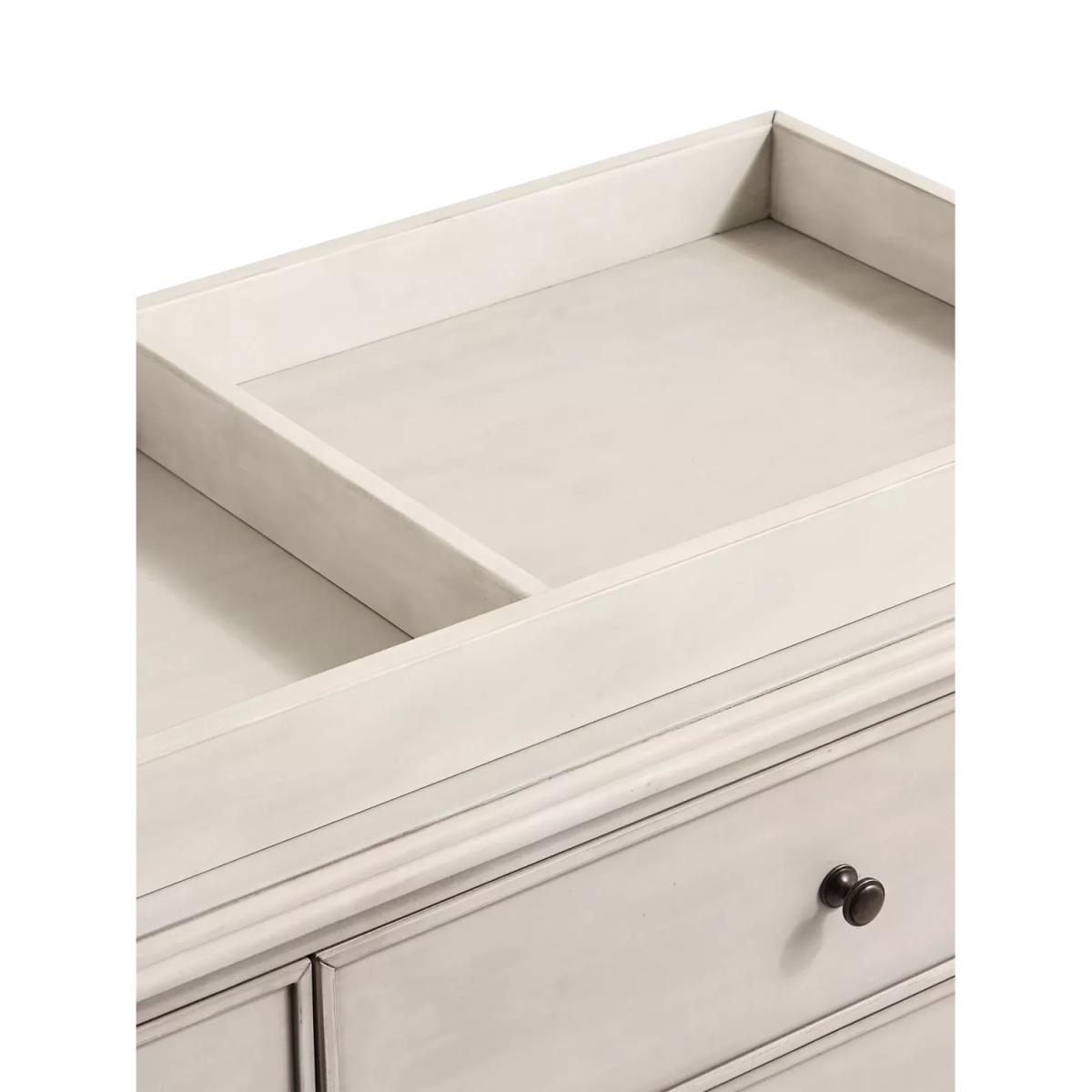 I’m a fan of the Harlow changer in antique grey for its solid, furniture-style look and soft neutral finish. The turned legs and framed drawer fronts sit equally well in a modern farmhouse nursery, a French-inspired scheme or a pared-back Scandi space, so it’s easy to layer in colour and texture without overwhelming the room. For practical styling, top it with a slim-line changing mat in a muted linen cover and keep nappies, wipes and creams in woven baskets or labelled trays on the surface. Inside the drawers, use small dividers or canvas bins to organise vests, sleepsuits and muslins. When it’s no longer needed for changing, it makes a handsome dresser in a bedroom or hallway.