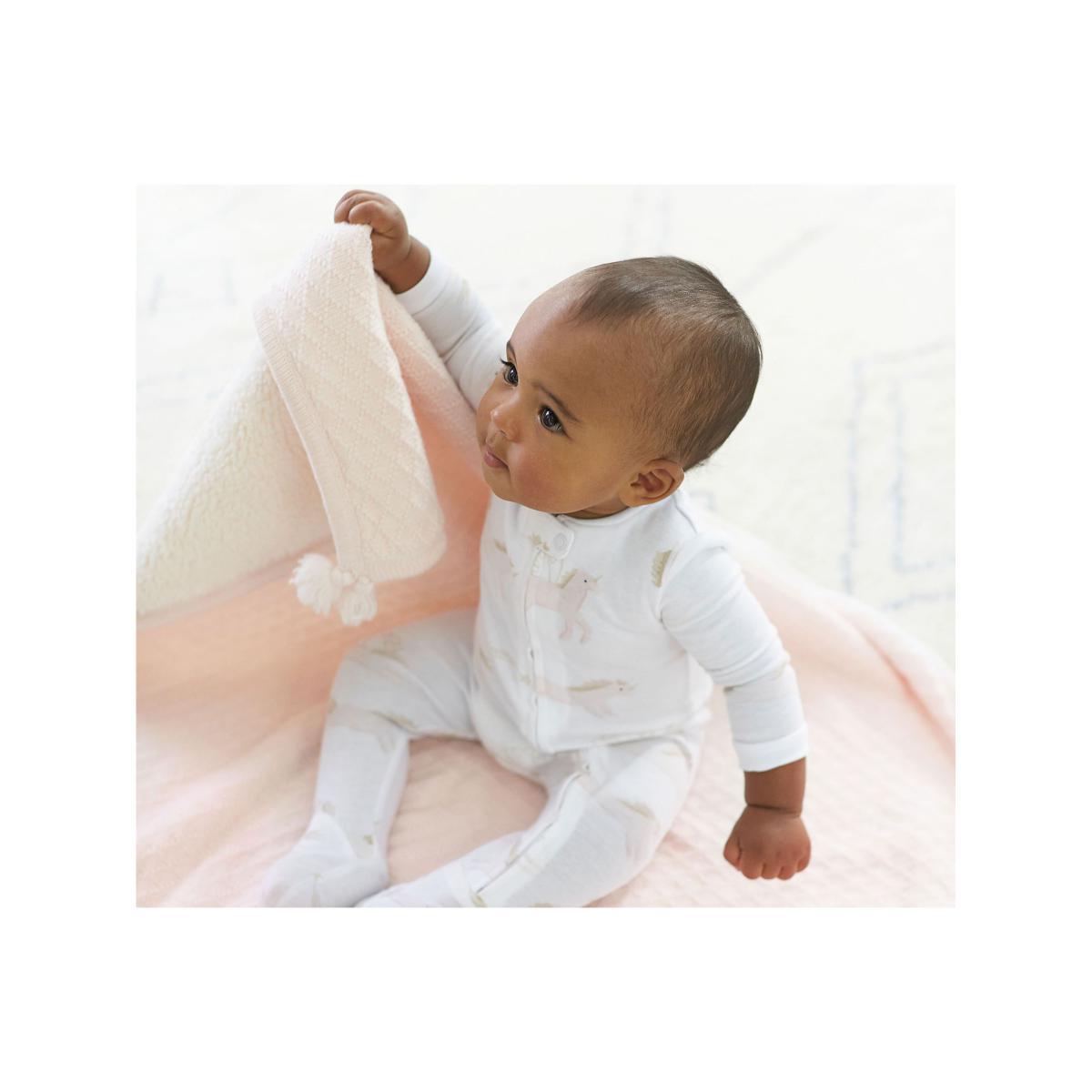 This luxurious baby blanket from Pottery Barn ensures your little one always has the cosiest and cutest of outings. The classic cable-knit design is enhanced with adorable pom-poms at the hem, adding a healthy dose of style to any adventure. Perfect for snuggles, it's extremely breathable and has been developed to a gorgeously soft Sherpa finish on the reverse.
