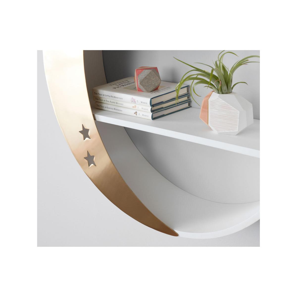 I really like the moon-shaped shelf - it’s a playful yet elegant piece that adds character to a child's room. Its soft white and gold finish makes it versatile enough to work well in both modern and traditional interiors, especially when paired with gentle pastel tones or neutral palettes. For styling, I suggest using it to display favourite toys, small books, or decorative items, keeping the shelves uncluttered to highlight its unique shape. It works particularly well above a bed or against a calm, understated wall, creating a focal point without overwhelming the space. The moon theme and subtle metallic accents also bring a touch of whimsy and sophistication, making it a lovely addition for a cosy, stylish nursery or child's bedroom.