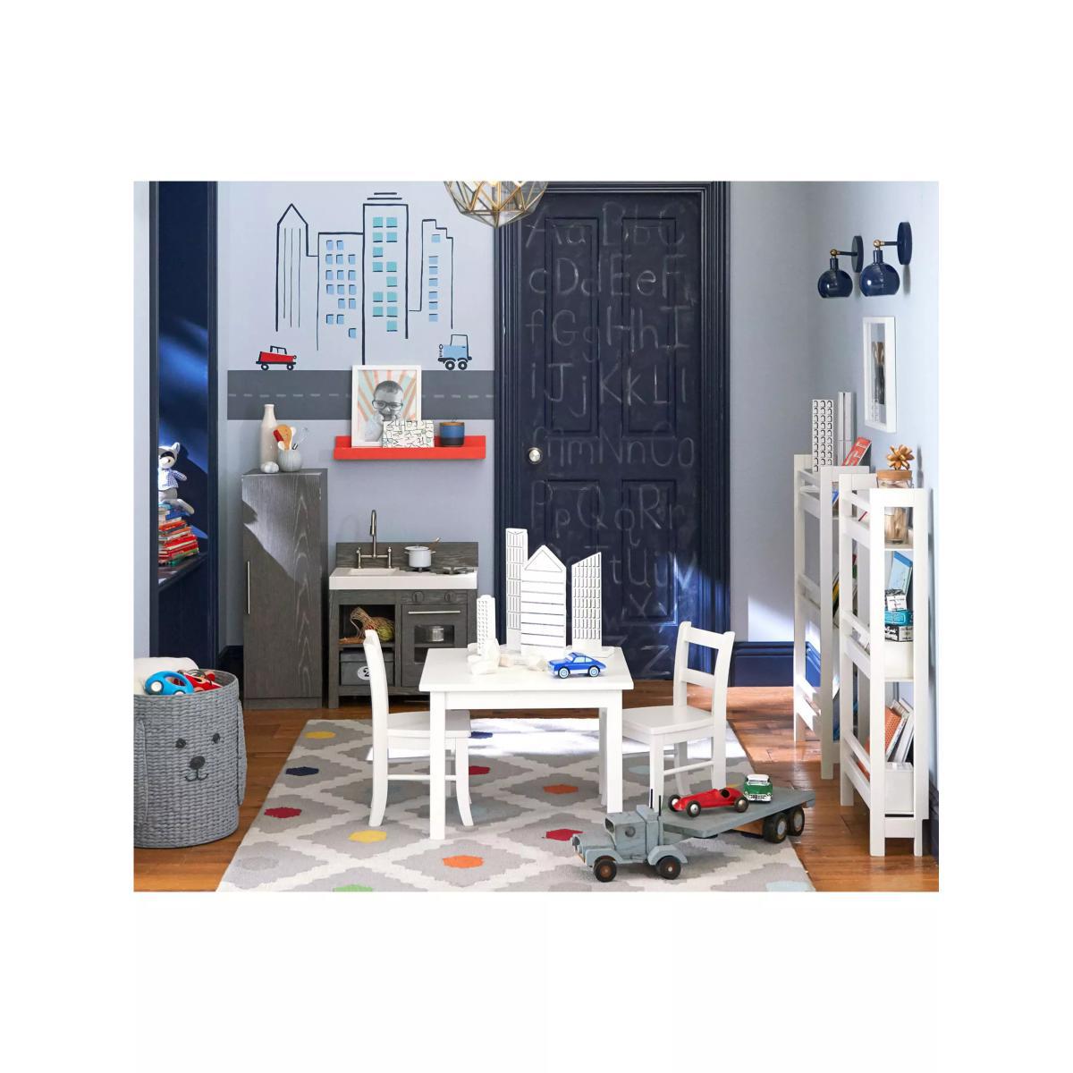 I love this little white play table for its versatility and clean aesthetic. Its neutral colour makes it easy to incorporate into a variety of interiors, from Scandi-inspired nurseries to cosy playrooms. It works particularly well styled with soft, colourful accessories or natural elements like wooden toys and cushions to create a warm, inviting space. Practical tips include pairing it with small chairs or floor cushions for comfort and setting up dedicated activity zones with storage bins nearby to keep everything organised. Its understated look also allows it to grow with your child, suiting a range of age-appropriate activities from arts and crafts to mealtimes.