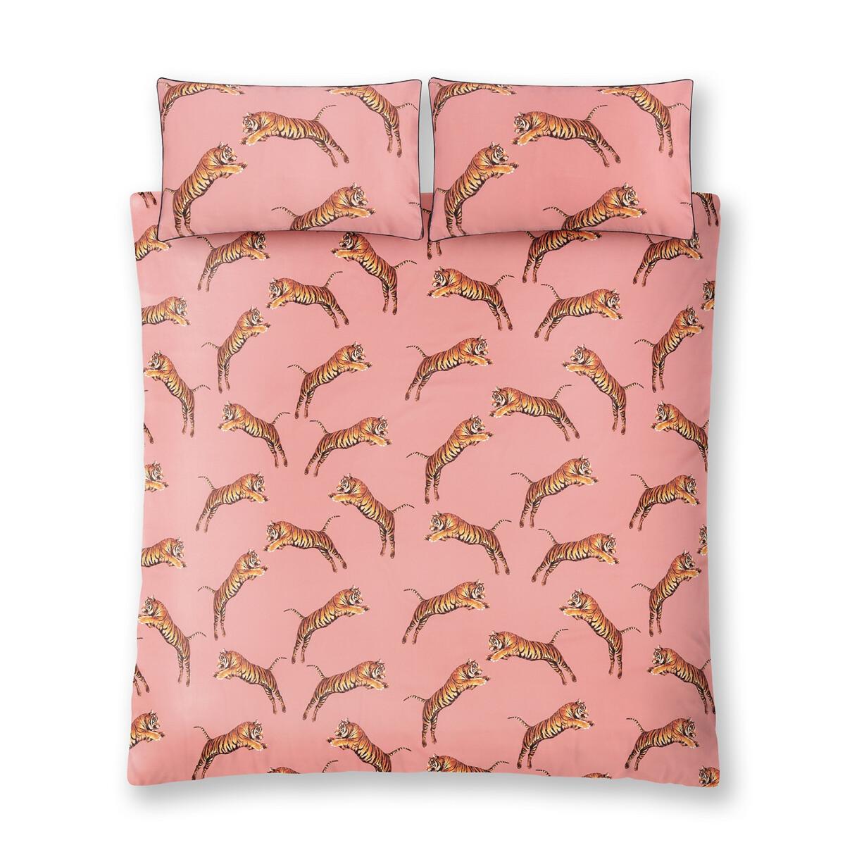 I love this tiger print bedding for its bold, playful vibe and eye-catching design. It works well in eclectic or boho interiors where a touch of exotic pattern adds personality, but it can also be a statement piece in more minimalist spaces if kept balanced with neutral tones elsewhere. For styling, consider pairing it with soft blush or beige accents to complement the pink backdrop, and introduce textures like velvet cushions or a woven throw for added depth. It's a practical choice too-easy to update a room's look without a major overhaul, making it a versatile and fun addition to any bedroom wanting a bit of wild charm.