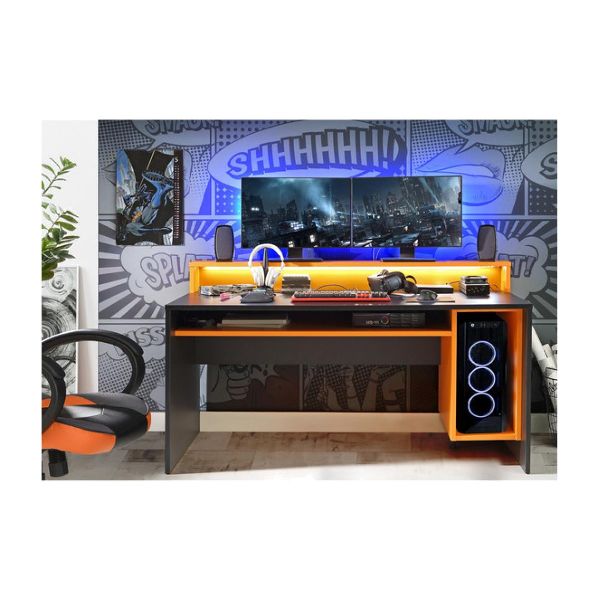 The Power Y was created with the gamer in mind and is beautifully designed with a striking, contemporary, contrasting orange and black finish. The elevated top shelf has space for two monitors and features underneath LED lighting with colour options of red, blue, green, white, yellow, aqua and purple to highlight the atmosphere, all controlled with a handy remote control. The remote can also be used to adjust the brightness. There is also a handy storage area with a cable port in the centre. The tower recess is generous enough to allow sufficient air circulation. The shelf beneath the desk offers useful accessible storage space and there's plenty of room on the spacious desk top for your keyboard and mouse. Finished in orange and black the Power Y gaming desk will look great in a bedroom or home office.