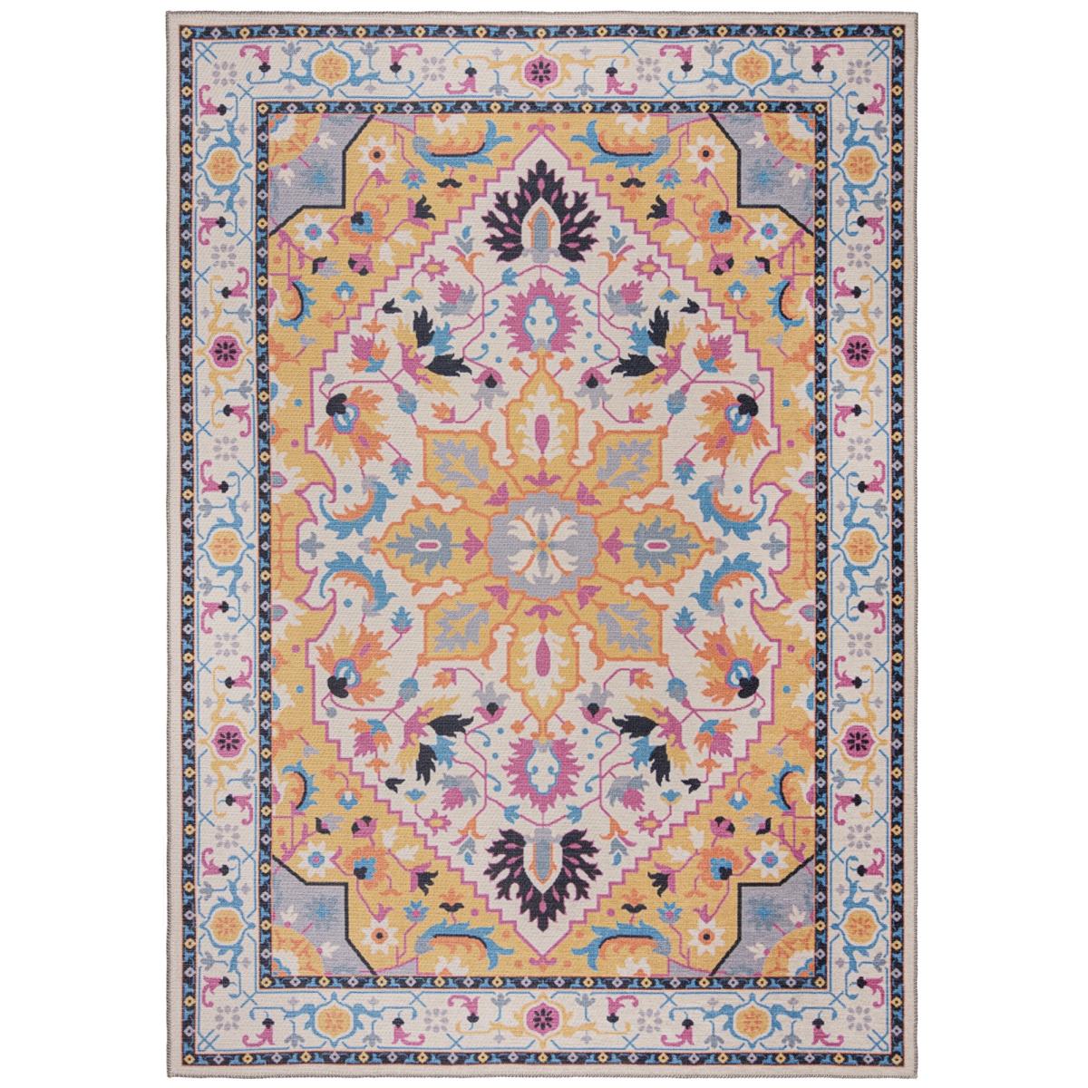 * Machine washable* Traditional floral design* Soft touch cotton blend* Perfect for any room in the home Transform your home with the timeless beauty of the Orla Traditional washable rug. Its intricate floral print, luxurious golden tones, and soft machine washable fibers make it a perfect fit for both traditional and modern homes. Whether it's the living room, bedroom, or even the messiest rooms like the kitchen and bathroom, this washable rug will add a touch of class. Care: Shake or vacuum to remove and loosen fibres, dirt and debris using a nozzle attachment. In the case of spillage, blot with a clean cloth. Place into the washing machine on a gentle cycle at 30 degrees and air-dry flat. Due to the nature of cotton expect a small amount of shrinkage after washing. For best results lay flat and reshape as soon as possible. We recommend our small and medium size washable rugs up to 120 x 170 will fit most washing machines sizes between 8 - 10kg. Please check your manufacturer guidelines before washing and do not overload the drum. For Large and High pile washable rugs a laundrette service may be required.