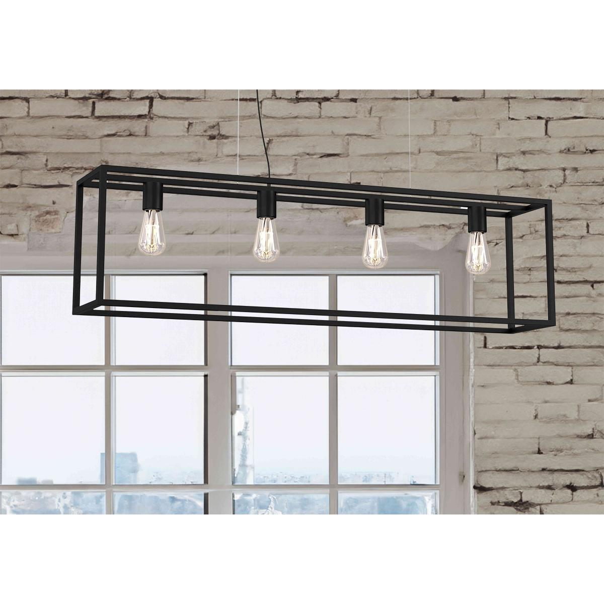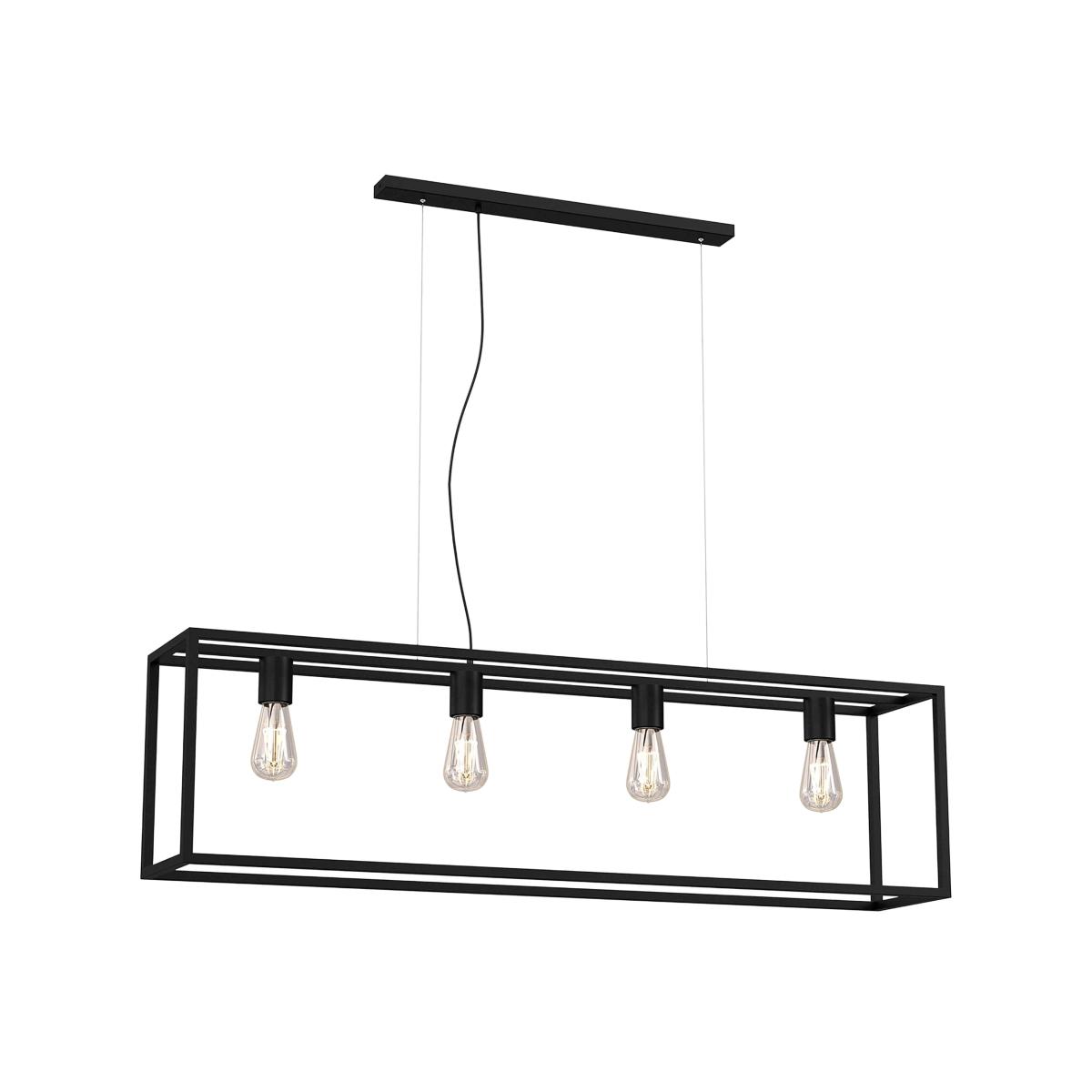 This bold four-bulb pendant light is akin to an industrial-style chandelier thanks to its simple frame design and black powder-coated iron construction. Why you'll love it This 4-bulb pendant light is simple yet striking. Contemporary industrial style. Made of iron with a black powder-coated finish. Suits vintage-style globe or filament bulbs. This chandelier is part of the Furniture Village lighting collection. What you need to know Professional installation recommended. Made of iron. Requires 4 x E27 max. 60 W bulbs (not included). Please do not exceed this wattage. Hand wash only. Dry with a soft cloth. Be sure to disconnect from the power outlet before cleaning. Dimensions Height: 25 cm (10 in). Width: 100 cm (40 in). Depth: 25 cm (10 in).