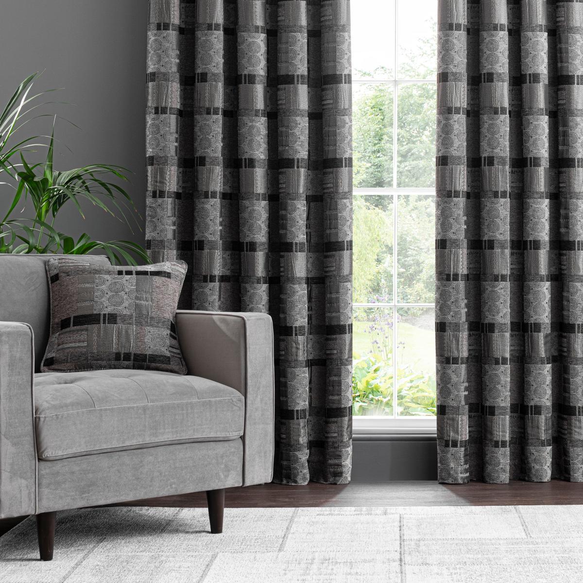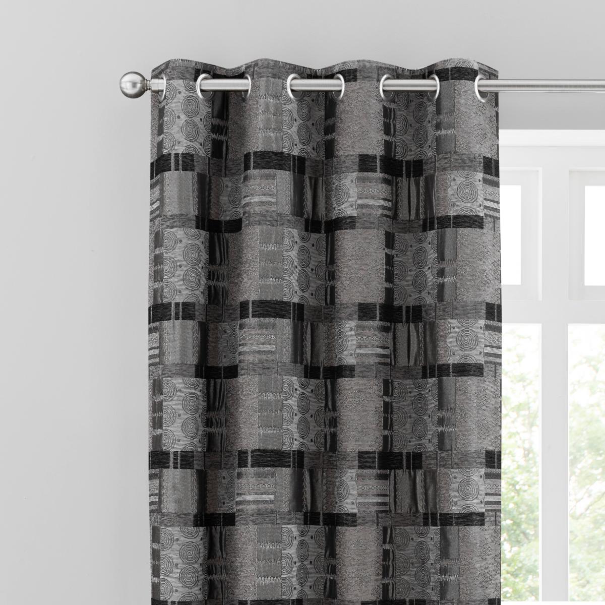 Our Prague curtains feature a rich patchwork of beautifully textured designs reminiscent of decorative brocades. This pair has been fashioned in a contemporary noir colourway which will complement any room interior. The eyelet header is ideal for creating full, elegant folds and allowing for smooth movement across your curtain pole, whilst the full lining increases privacy and provides an improved drape. Available in a range of sizes to suit your requirements. Please note:. Pattern matching can not be guaranteed across multiple pairs of curtains.