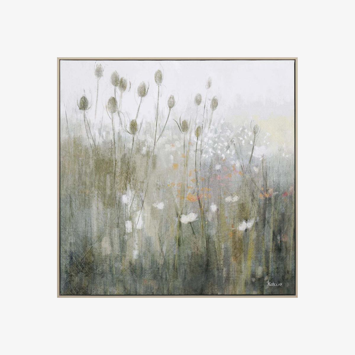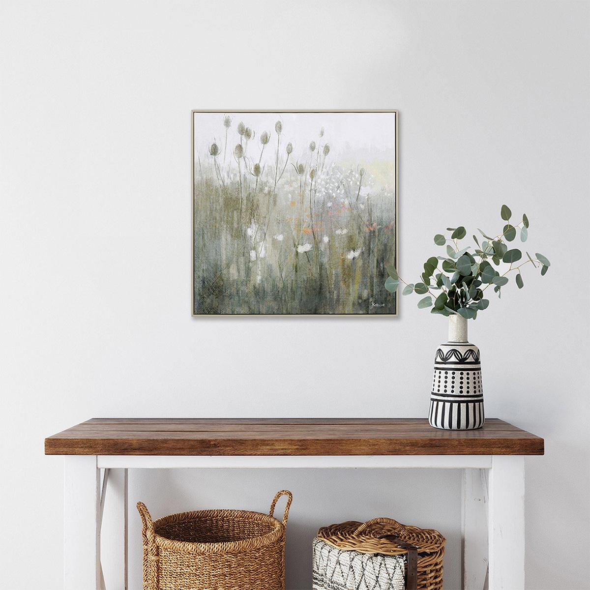 I love this piece for its subtle, calming palette and natural motif, making it versatile for a range of interiors. It works particularly well in relaxed, neutral spaces like Scandinavian-inspired schemes or rustic farmhouse styles. To style it effectively, consider pairing it with natural textures-wooden or wicker furniture-and keeping accessories minimal to let the artwork stand out. Hanging it at eye level in a living room or bedroom can create a centrepiece that adds a touch of understated elegance. Its understated design also lends itself to layering with other artwork or prints for a personalised, curated look.