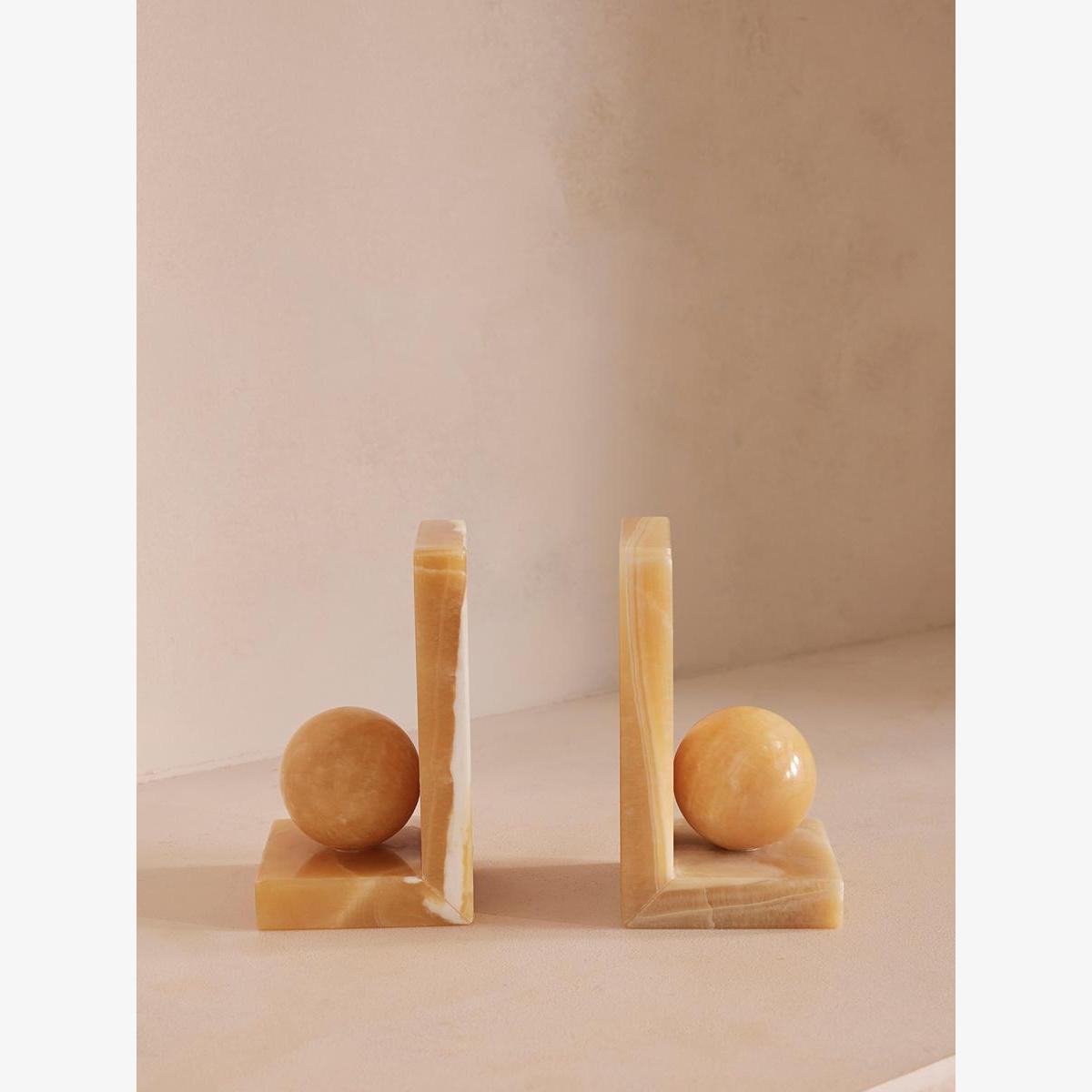 A globe accent rests at the centre of an angular silhouette carved from warm Mango Onyx stone. Our weighty Prato bookends are made from a Mango Onyx stone, recognised for its warm orange tones, light, white veining and natural variations that make each piece entirely unique. They're designed to mirror the decor seen in 180 House, particularly when layered with other pieces on your shelves.