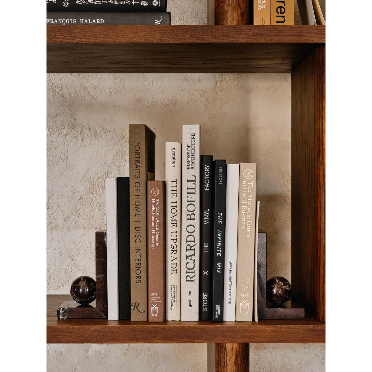 I’m a big fan of the Prato ends - their crisp L-shape and matching marble spheres feel both sculptural and straightforward. The deep russet tone works brilliantly against crisp white shelving or amidst a library of neutral-toned hardbacks, and they’ll anchor a row of books without drawing too much attention. To style them, slot larger volumes between the pair and leave space on one side for a low-profile vase or small plant, so the bookends themselves remain the focal point.