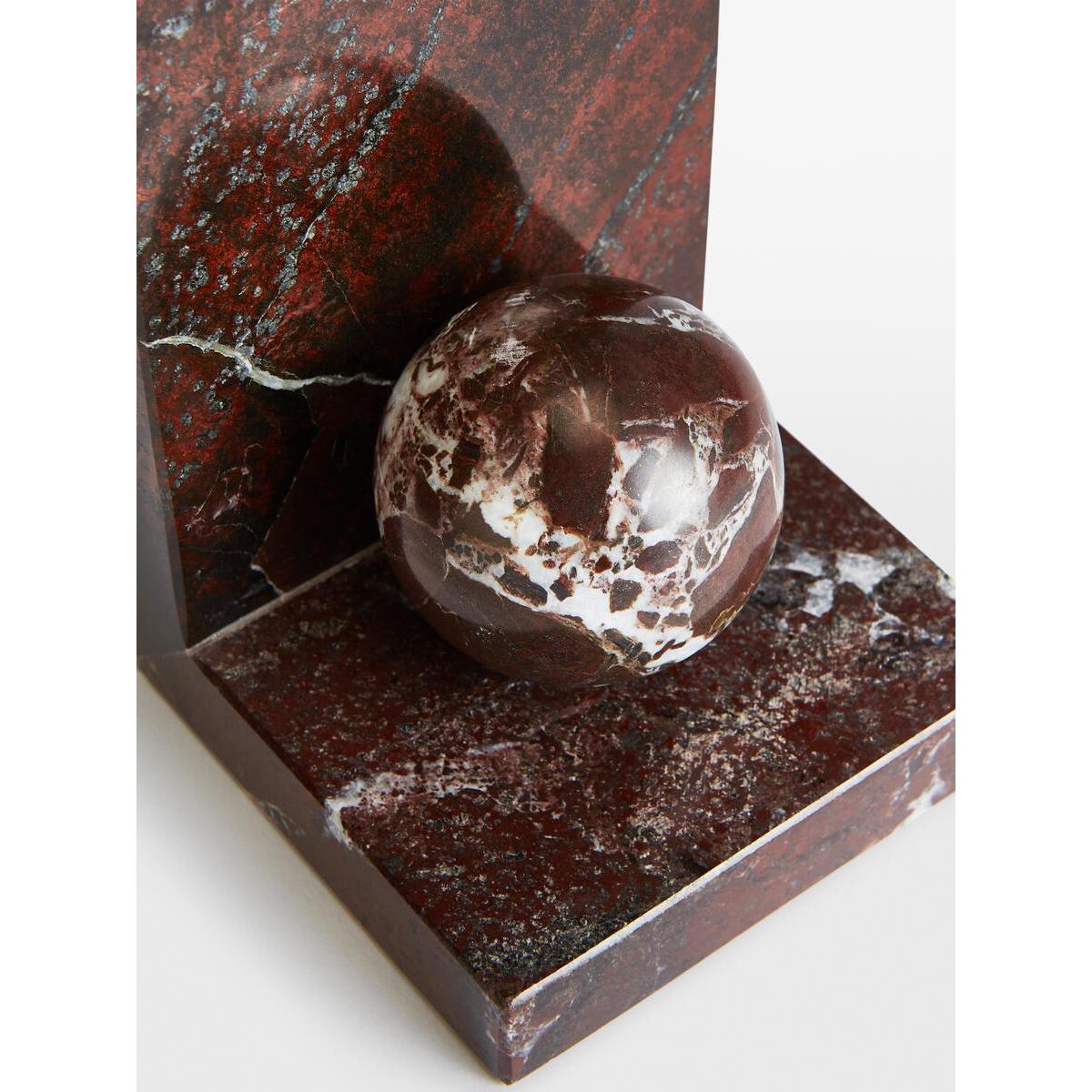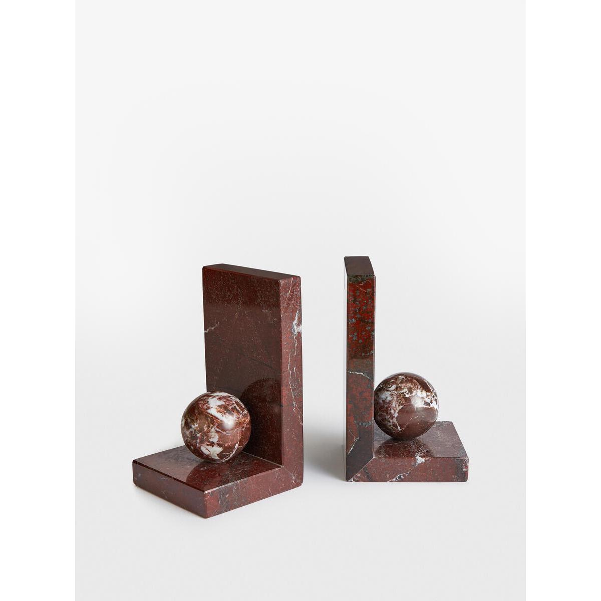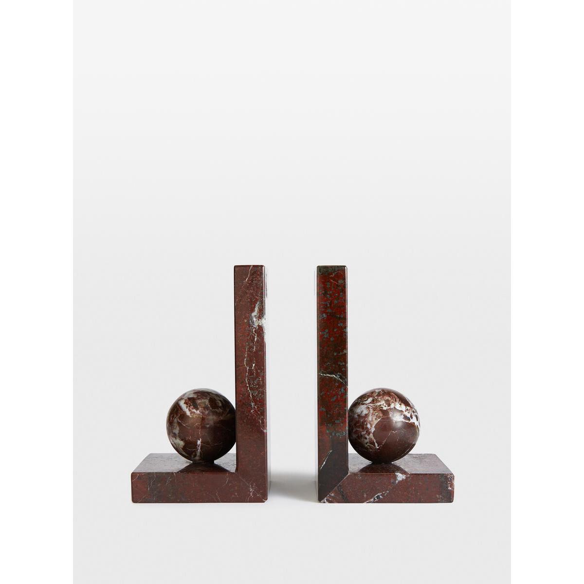 These weighty bookends are made from Rosso Levanto marble,recognised for its deep cherry-red tones, white veining and naturalvariations that make each piece entirely unique. A globe accentrests in the centre of each bookend to contrast the clean structureof the base. Use the bookends to stack and display your favouritenovels, and to reference the decor seen at 180 House. Pair of Rosso Levanto marble bookends. Distinctive natural veining. Inspired by 180 House.