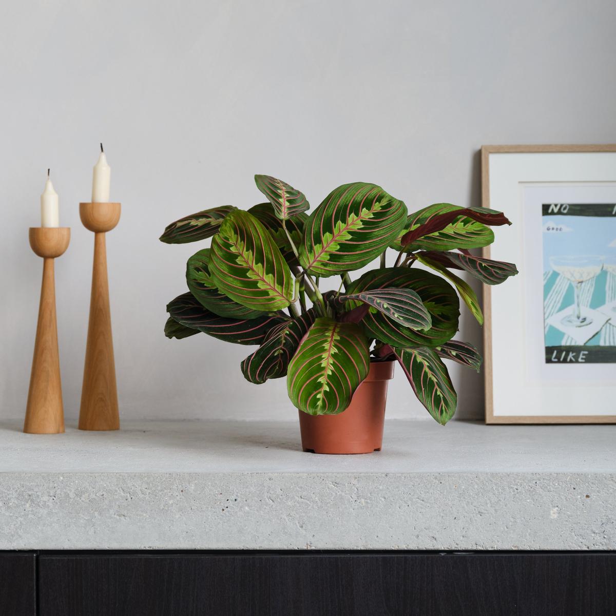 This distinctive plant earned its name because of the way its leaves fold together at night, almost like hands closed together in prayer. Instantly recognisable for its stunning green leaves with red veins and beautiful, contrasting pink undersides. The Prayer Plant is a member of the Calathea family, but it’s incredibly easy to care for. As this item comes without a plant pot, shop our range here to find the perfect match for you and your home interior. Please note: As this is a living product your plant may vary to the one photographed. Plant height measurement includes the pot. Width measurement is for the width of the pot only; width of the plant may vary. Please note, unfortunately we cannot deliver this item to Northern Ireland or the Channel Islands.