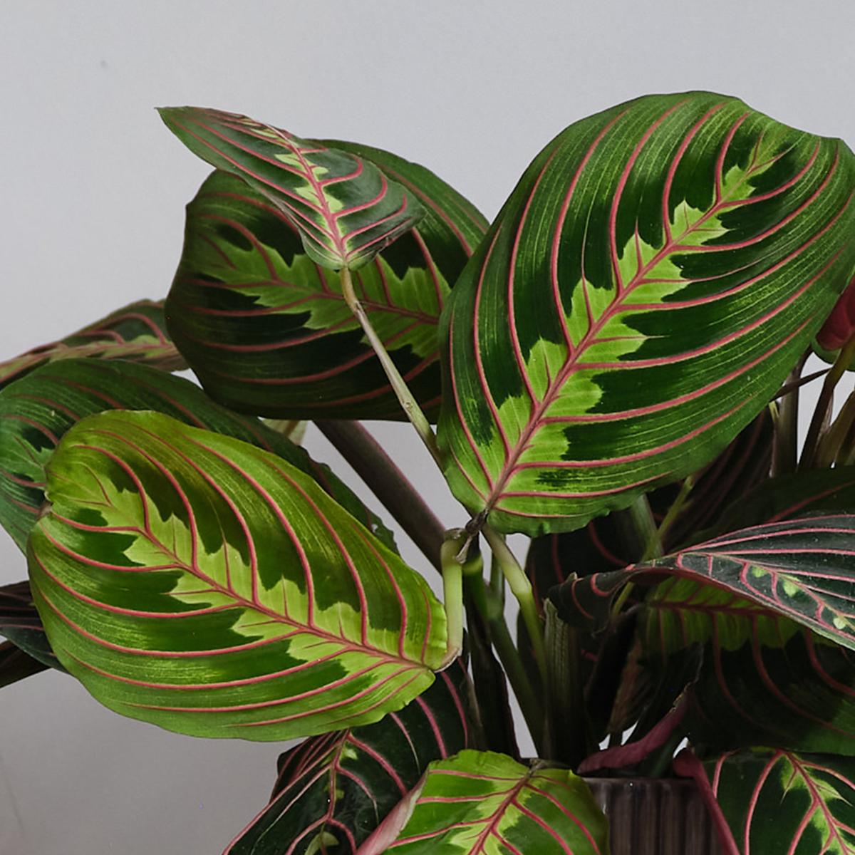 This distinctive plant earned its name because of the way its leaves fold together at night, almost like hands closed together in prayer. Instantly recognisable for its stunning green leaves with red veins and beautiful, contrasting pink undersides. The Prayer Plant is a member of the Calathea family, but it’s incredibly easy to care for. Paired with a hand-finished, perfectly-fitting coloured earthenware pot. Please note: As this is a living product your plant may vary to the one photographed. Plant height measurement includes the pot. Width measurement is for the width of the pot only; width of the plant may vary. Please note, unfortunately we cannot deliver this item to Northern Ireland or the Channel Islands.