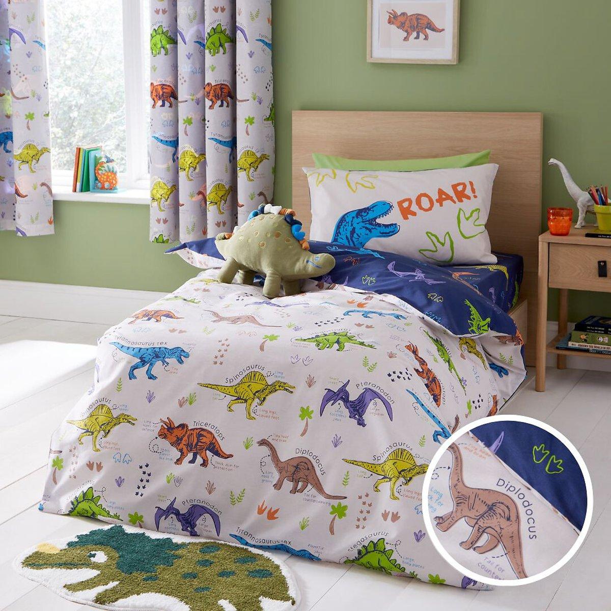 Bring your child's love of dinosaurs to life with this playful dinosaur bedlinen. Featuring cute and colourful illustrations of their favourite dinosaurs on a natural earthy base, this bedding is perfect for sparking your child's imagination and sense of wonder. Fully reversible, with a deep navy base, giving you two looks in one and created from easy-care and durable polycotton fabric for everyday use. Catherine Lansfield is renowned for style and quality - designed and developed in Great Britain. Polyester. Sizes Available: - 150x120cm - 200x135cm - 200x200cm. This product will be dispatched by one of our trusted suppliers. You’ll be contacted by their selected courier about your delivery. TURNE01