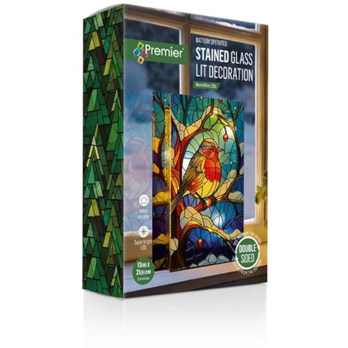 Add a glowing touch of tradition to your Christmas décor with this Premier Lit Robin on Branch Stained Glass - 21cmt. Featuring a double-sided robin on branch design, this festive tabletop decoration is lit from the centre with 50 warm white LED lights, creating a cosy stained-glass window look. Perfect for use on your table, mantel, shelf, or window display, it spreads warm seasonal charm while being easy to place anywhere thanks to its battery operation (2 x AAA, not included). A timeless Christmas decoration you’ll love bringing out year after year. Features: Dimensions: 21 x 13 cm Double-sided design Includes 21 x 13 cm battery operated candles Uses 2 x AAA size batteries (not included) Indoor use only