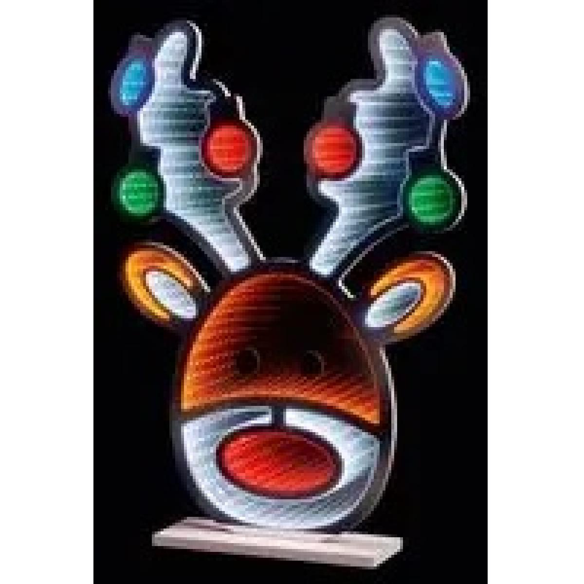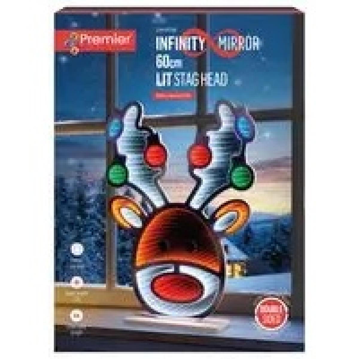 The Premier Standing Stag Head with Baubles Infinity Mirror - 60cm is a striking decorative piece that blends festive charm with modern elegance. Standing tall at 60cm, this majestic stag head features a sleek mirrored finish that creates a captivating infinity effect, reflecting light and surrounding decor in a dazzling display. Adorned with delicate baubles, it adds a touch of seasonal sparkle, making it a perfect centrepiece for holiday arrangements or stylish winter interiors. Whether placed on a mantel, side table, or entryway, this enchanting stag head brings a bold yet graceful presence to any space. Features: Indoor use only Mains powered (low voltage) Static function Double sided design Cable length: 5m Clear cable Dimensions (HxWx. D): 600x400x100mm