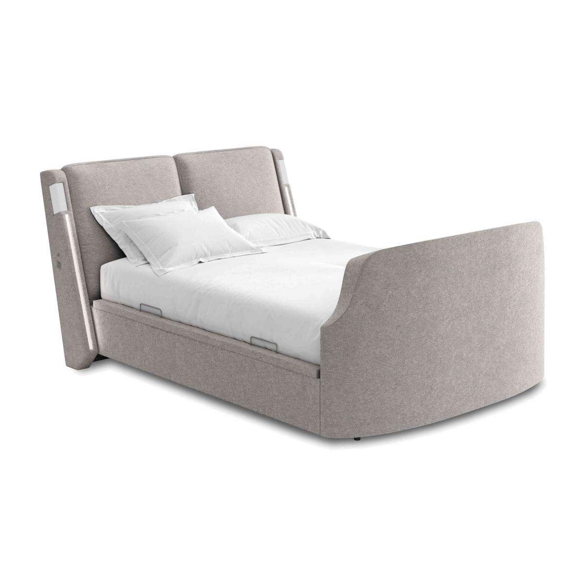 If you like to watch movies in bed, you’ll love this very stylish ottoman TV bed frame with Dolby Atmos surround sound, built-in feature lighting and space-saving side-lift ottoman storage compartment. Why you'll love it Upgrade your movie-watching experience with this fabulous ottoman TV bed frame. Dolby Atmos surround sound speakers are built into the headboard and foot end. Foot end can accommodate a 43 inch TV. Feature lighting on either side of the sumptuously cushioned headboard. With USB and USB-C charging ports. Glam modern style with cool curves and minimal headboard embellishment. Feet are integrated into the bed frame’s curves. This bed frame is upholstered in a fashionable light grey fabric. Spacious ottoman storage compartment for bedding, pillows and clothing. Opens at the side – ideal for a smaller or narrower bedroom. In double, king and super king bed sizes. This ottoman TV bed frame is part of the Furniture Village bed frame collection. What you need to know Mattress sold separately. TV not included. Maximum mattress weight is 50 kg for double, 65 kg for king and 70 kg for super king. Please keep hands clear of the mechanism when opening and closing the ottoman. Do not sit on this ottoman bed frame when opening. Clean regularly using a soft brush or vacuum with the curtain attachment. Deal with any spills promptly. Professional cleaning advised for oil- and grease-based stains. Some fabrics can show wear on areas of more use or in direct sunlight. Flattening and shading of heavy wear areas on pile fabrics like velvet is unavoidable. Be sure to brush pile fabrics only in the direction of the pile. Please read our upholstery care guide for more advice. Please note: Your TV must be Dolby Atmos compatible to get the most from this smart TV bed frame.