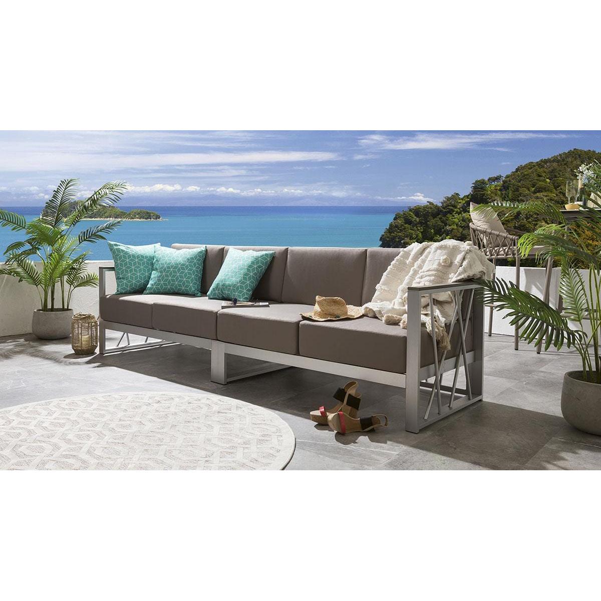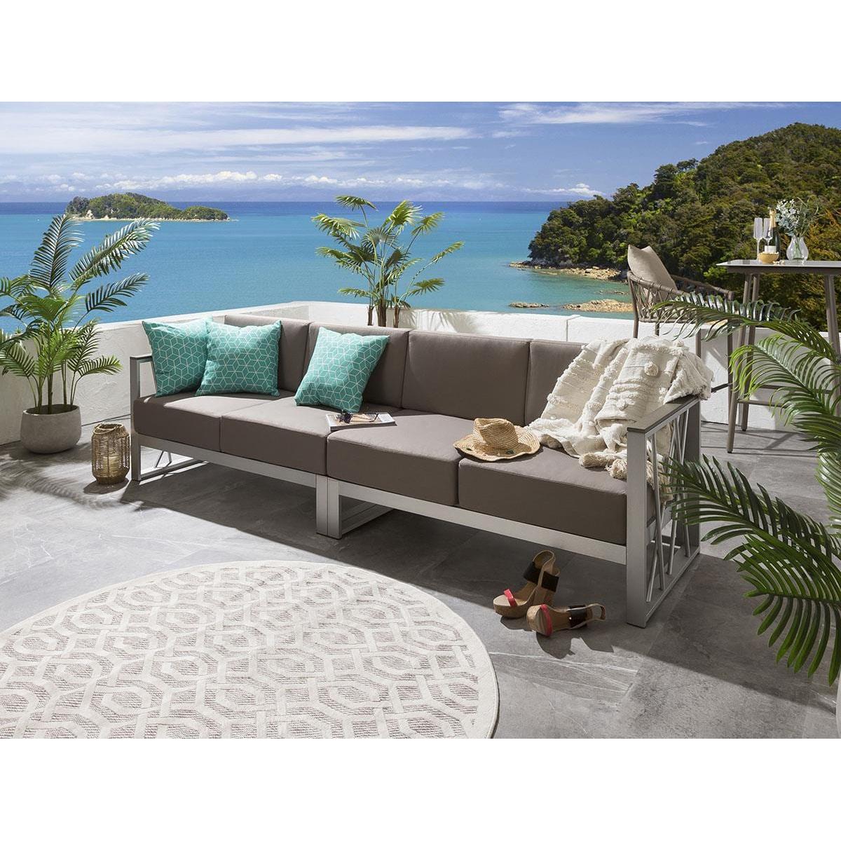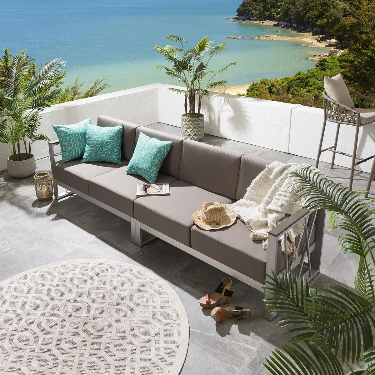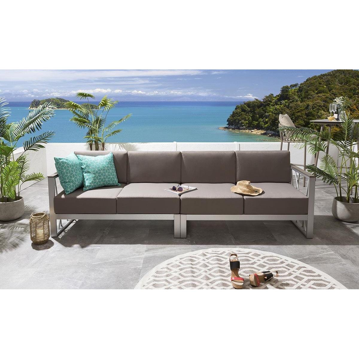 If you are seeking an ultra-modern, super-sharp Taupe garden modular sofa set that is also practical and comfortable, look no further. This stunning outdoor 4 seater garden sofa will make a gorgeous addition to your outdoor seating area or patio. All sections come with their own winter cover. The outdoor sofa set comes complete with our signature luxuriously thick cushioning that offers unbeatable comfort, topped off with rich Taupe high-end marine fabric which has amazing resilience to colour fading and damage caused by extreme weather conditions. Expertly crafted brushed aluminium modern frames are highly durable, complemented by the UV and weather-resistant polywood arms which will continue to look great after many years and are super-easy to clean, guaranteeing years of enjoyment with the modular garden sofa. If you need more information about this product, use the Live Chat service to speak to the team or send us a message. Spread the cost our with interest-free finance options. Minimum spend applies. W263cm D70cm H78cm 4 Seater Garden Sofa Free beige protective cover included