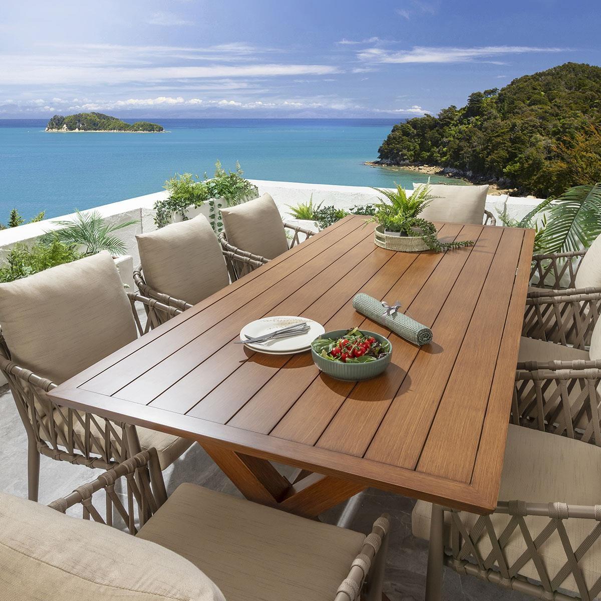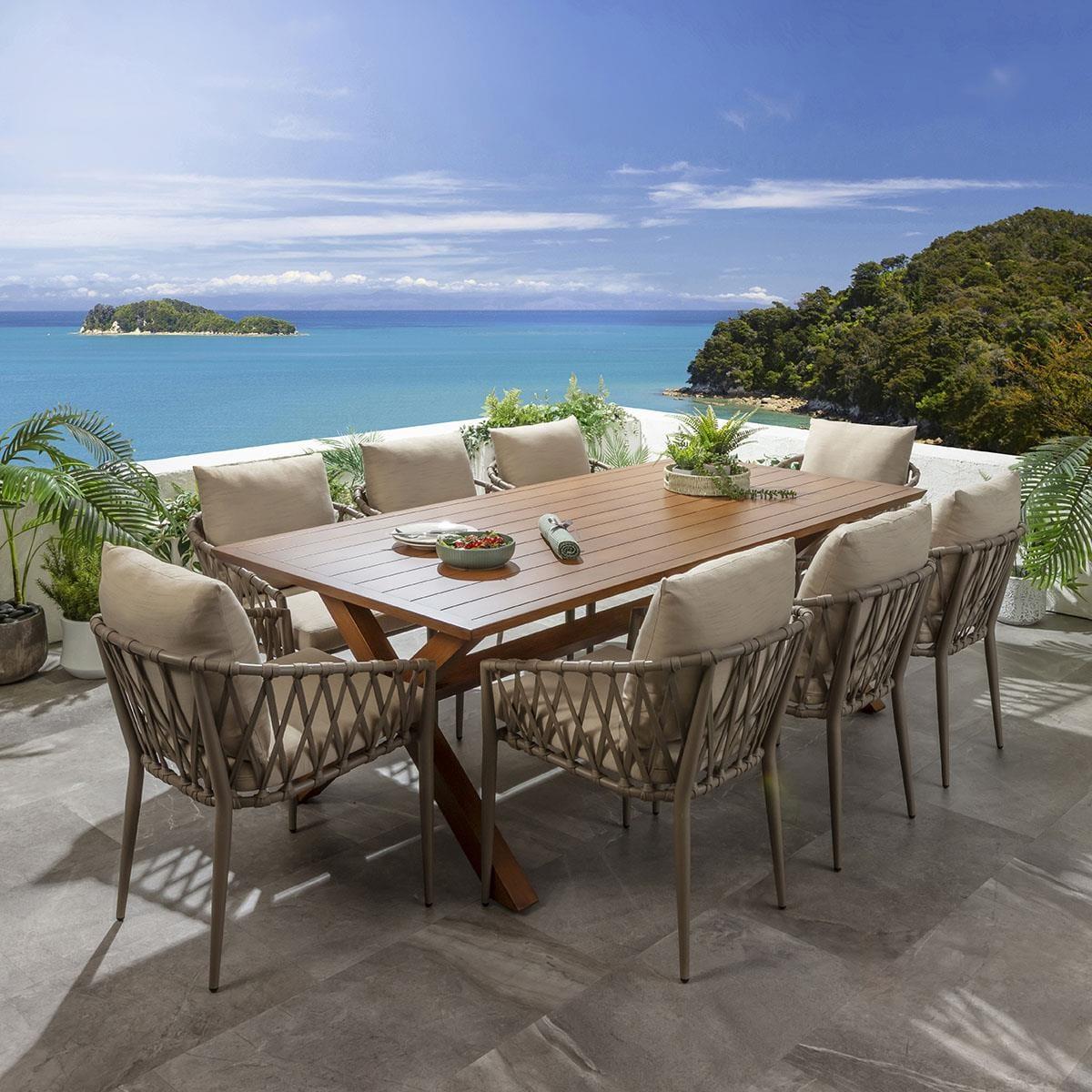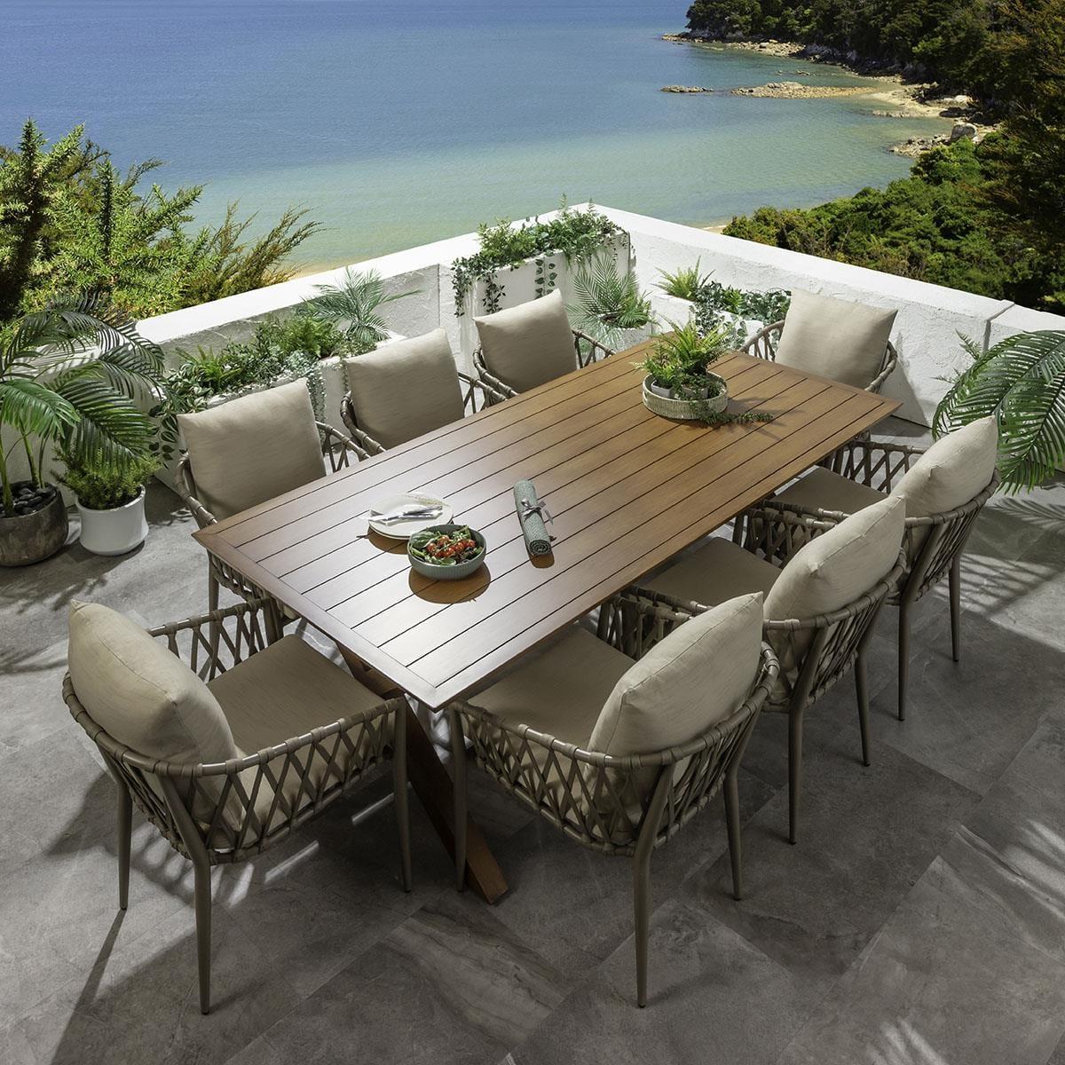 This 8 seater garden dining table and chairs set includes a farmhouse-inspired dining table, featuring a beige finish and X-legs, crafted from full aluminium, with beige rope garden dining chairs made from aluminium, making them weather-resistant for outdoor use. This outdoor dining set is crafted for durability and comfort. The Star 220cm modern garden dining table boasts a farmhouse-inspired design, featuring an elegant beige finish and distinctive Cross X-leg design. Crafted from full aluminium, this weatherproof 8-seater outdoor table is designed to withstand the elements, allowing you to leave it uncovered year-round. Reinvent your patio dining space with these fabulous all-weather beige rope-back garden dining chairs. These 8 generously padded outdoor chairs are enhanced by a supportive back cushion for an extra layer of luxurious comfort. The Verity garden chair frames are crafted from aluminium, making them highly durable and weather-resistant for outdoor use. This 8 seater dining set combines modern Verity chairs with the stunning Star table. Whether you love the Verity chairs and would like to purchase them individually, or you think the Star table would complete your outdoor dining space better with another chair, you can easily mix and match our garden tables and chairs to curate something truly unique. Table Size W220cm D93cm H76cm Chair Size W60cm D63cm H83cm Modern Garden Dining Set for 8