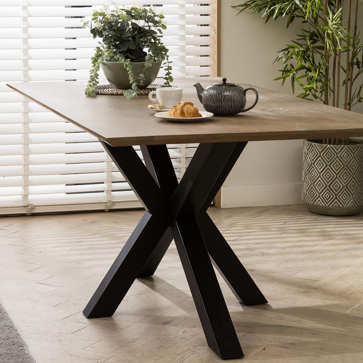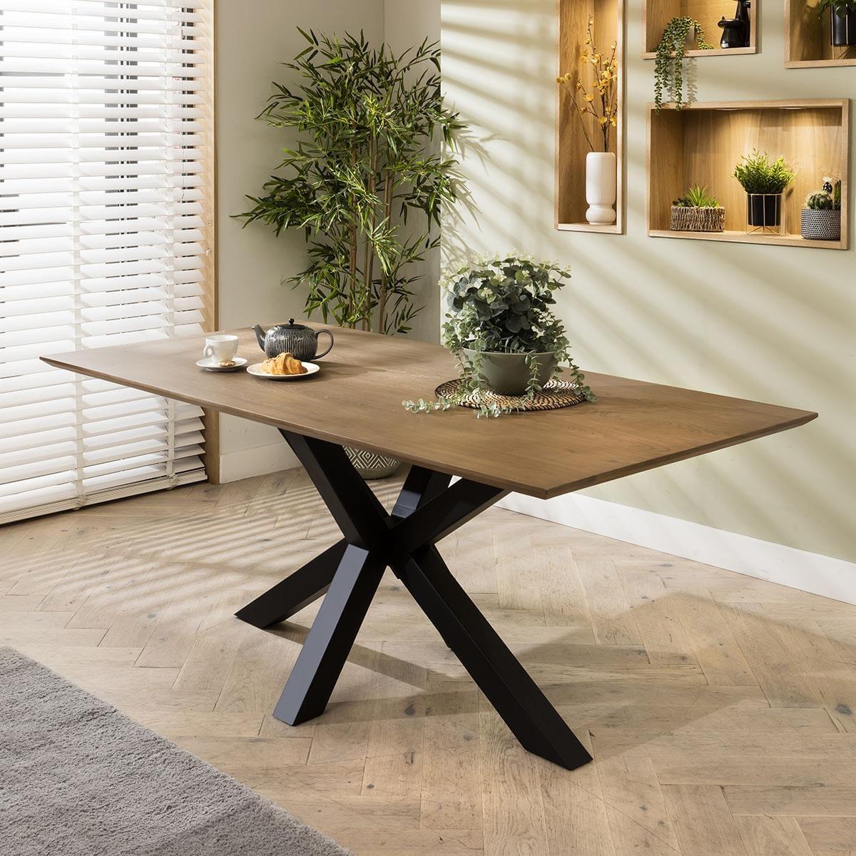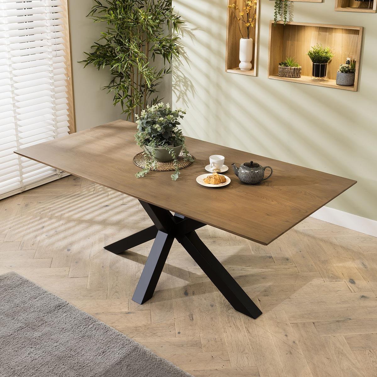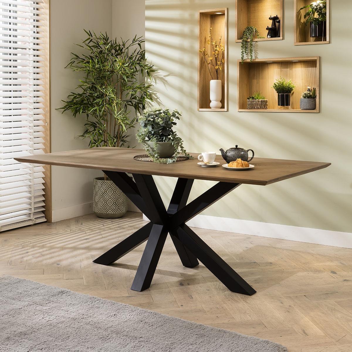 The Aries Wooden Dining Table for 8 has a stained finish that enhances the natural beauty of the wood. This modern industrial inspired 6 to 8 seater dining table is expertly crafted from solid wood, ensuring long-lasting durability. The sleek black star spider pedestal base supports the large premium 190cm table top. With a reverse chamfer edge, it exudes modernity and adds a touch of uniqueness to your space. Reinforcing its durability, metal brackets have been expertly incorporated to strengthen the construction, ensuring longevity for years to come. Featuring a black industrial star-shaped spider wooden pedestal base, this table effortlessly blends contemporary style with industrial charm. The contrasting combination of the dark leg against the light wood creates a striking visual appeal, making it a focal point in any dining area. Bring elegance and functionality together with the Aries Wooden Dining Table. Its thoughtfully designed features, including the solid wood construction, reverse chamfer edge, and modern pedestal spider base, make it a remarkable addition to any home. Discover the perfect balance of style and durability with the Aries Dining Table for 6 to 8, an exceptional choice for those seeking a statement piece for their dining space. W190cm D95cm H78cm Tabletop Thickness 3cm Modern 8 Seater Wooden Dining Table