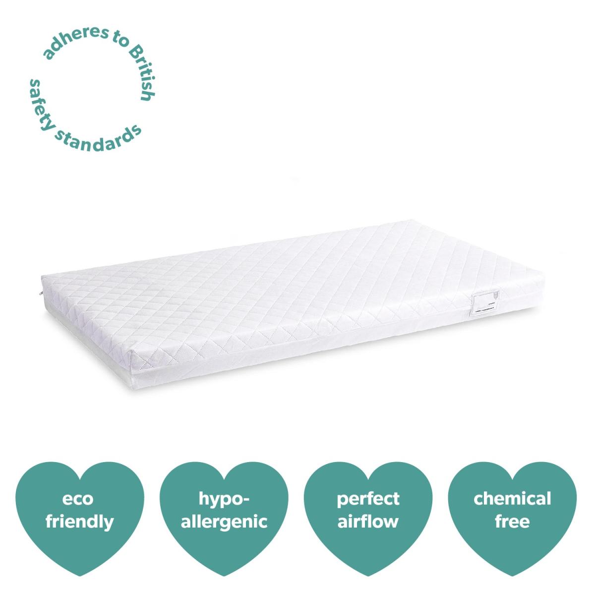 This breathable, chemical-free cot bed mattress is perfect for your growing baby. Its long-lasting full-fibre inner supports your little one while they sleep, moulding to the contours of their body. It also features a removable hypoallergenic cover, which is washable and also has moisture control cover. So, you can rest assured that any bedtime accidents that do occur are dealt with quickly.