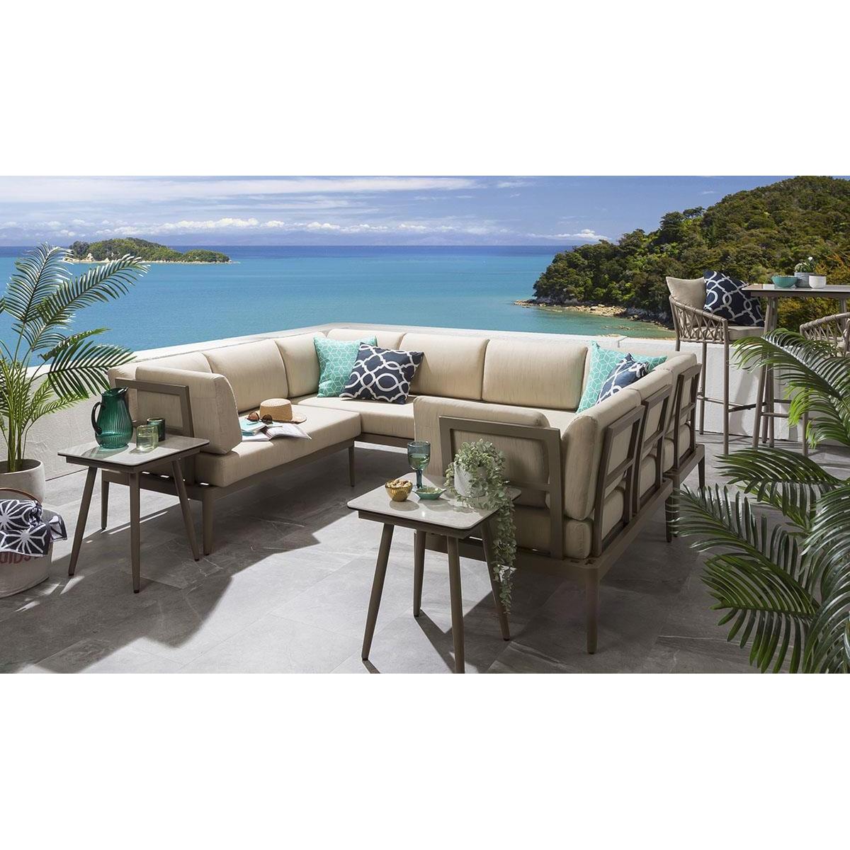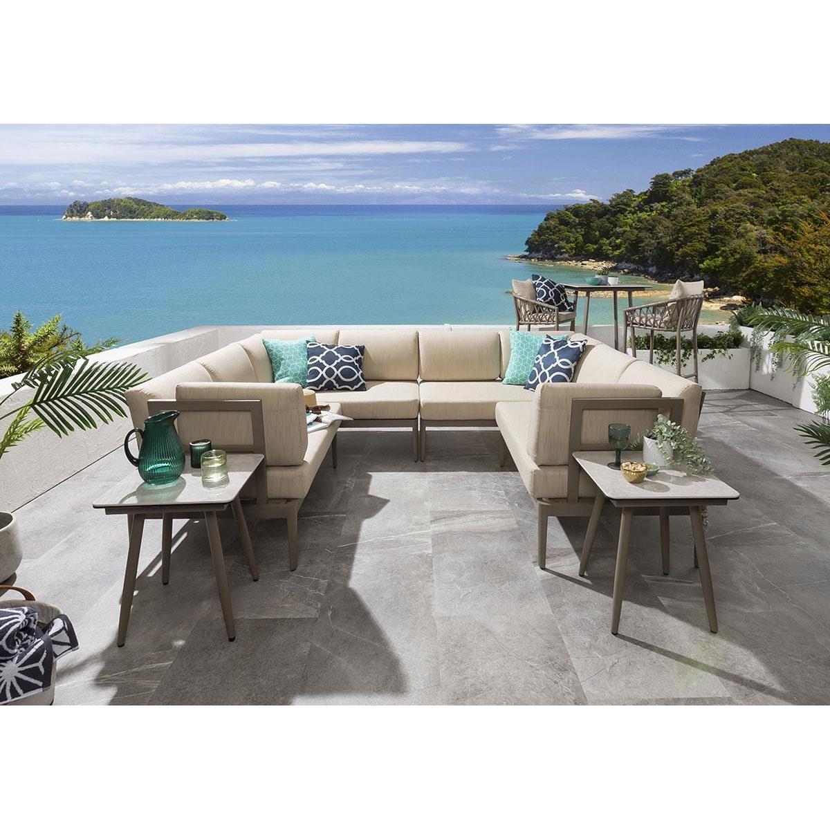 It is the perfect compact beige garden sofa for smaller gardens - including four simple sections that come together to form a luxury 8 seater garden sofa that can be configured in a straight, left or right-hand layout, even a U-shape corner sofa depending on your space. This set also comes with 2 side tables. Our clever Ada Modular Corner Sofa will make a stunning addition to your outdoor seating area or patio. The small garden corner sofa comes complete with our signature luxuriously thick cushioning that offers unbeatable comfort, topped off with rich Beige high-end marine fabric which has amazing resilience to colour fading and damage caused by extreme weather conditions and also a free winter cover. Expertly crafted aluminium frames are highly durable, complemented by clean lines that lend contemporary style. It is robust and weather-resistant for outdoor use & the firm-cushioned seating offers comfortable support that's shower-resistant, but we advise that cushions are stored when not in use. If you need more information about this product, use the Live Chat service to speak to the team or send us a message. Spread the cost our with interest-free finance options. Minimum spend applies. W250cm D242cm H81cm 8-Seater Beige Garden U-Shape Corner Sofa - Modular Design For Your Outdoor Space Set includes 4 reversible sofa sections and 2 side tables