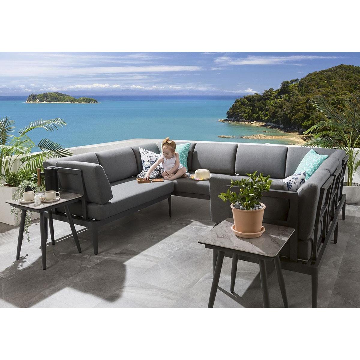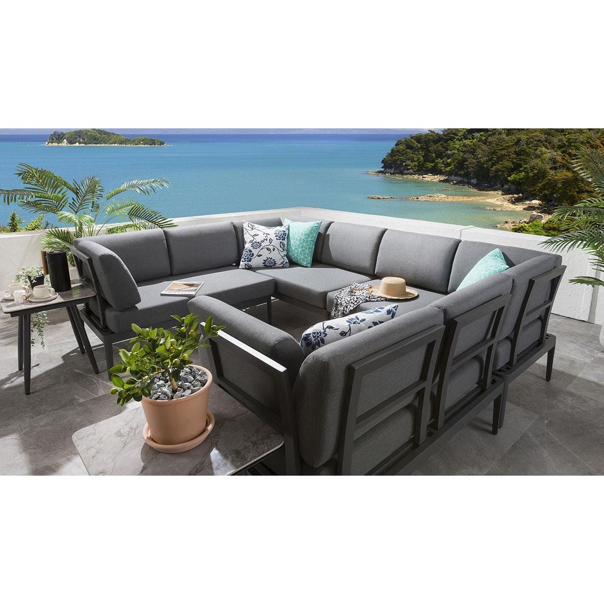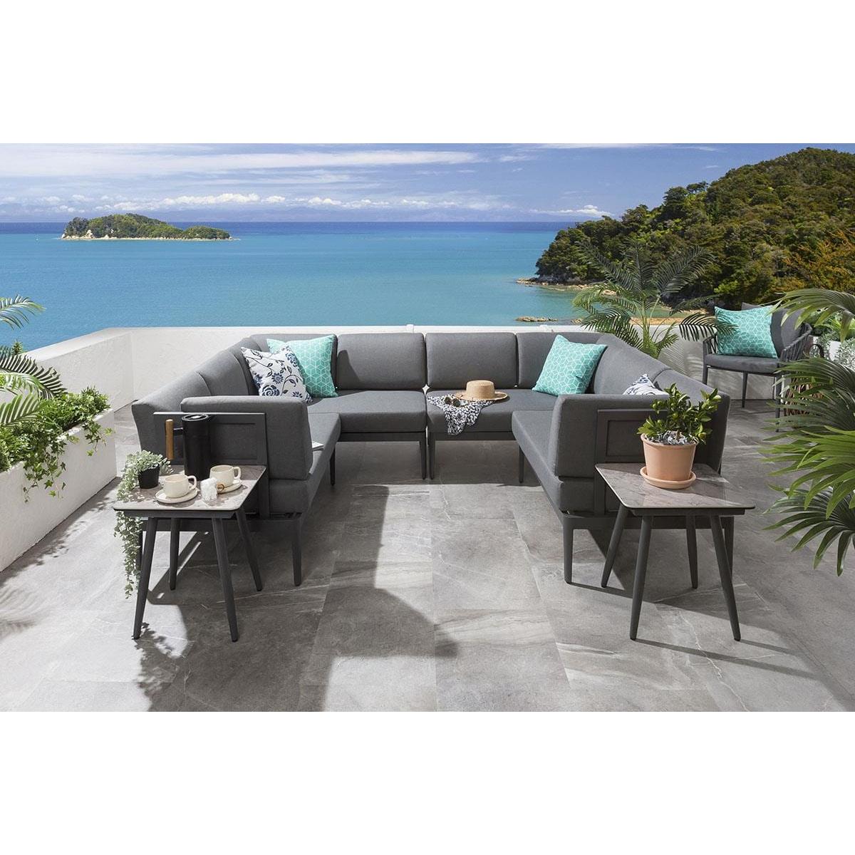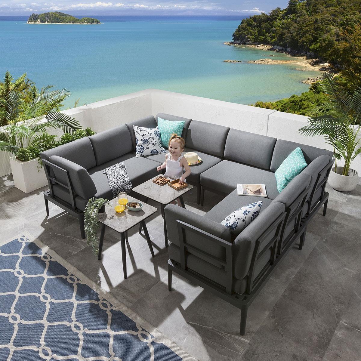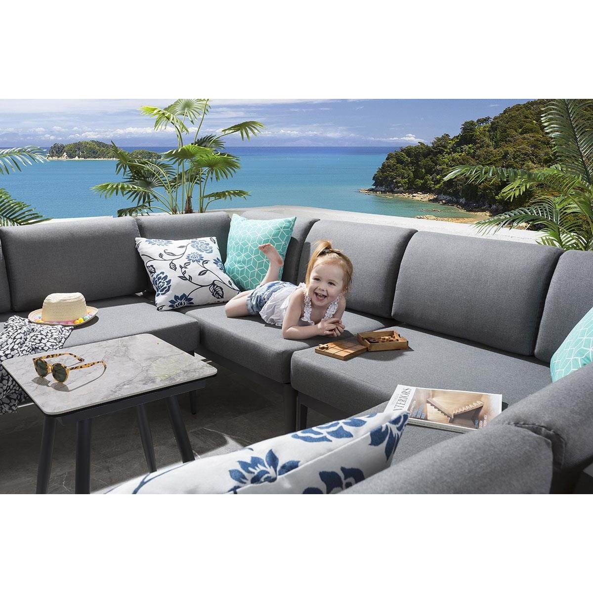 It is the perfect compact grey garden sofa for smaller gardens - including four simple sections that come together to form a luxury 8 seater garden sofa that can be configured in a straight, left or right-hand layout, even a U-shape corner sofa depending on your space. This set also comes with 2 side tables. Our clever Ada Modular Corner Sofa will make a stunning addition to your outdoor seating area or patio. The small garden corner sofa comes complete with our signature luxuriously thick cushioning that offers unbeatable comfort, topped off with rich Beige high-end marine fabric which has amazing resilience to colour fading and damage caused by extreme weather conditions and also a free winter cover. Expertly crafted aluminium frames are highly durable, complemented by clean lines that lend contemporary style. It is robust and weather-resistant for outdoor use & the firm-cushioned seating offers comfortable support that's shower-resistant, but we advise that cushions are stored when not in use. If you need more information about this product, use the Live Chat service to speak to the team or send us a message. Spread the cost our with interest-free finance options. Minimum spend applies. W250cm D242cm H81cm 8-Seater Grey Garden U-Shape Corner Sofa - Modular Design For Your Outdoor Space Set includes 4 reversible sofa sections and 2 side tables