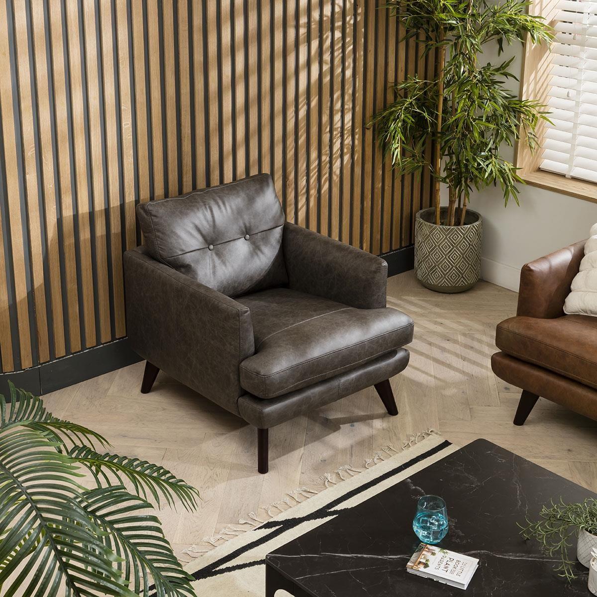 The simple Scandinavian inspired design of the Modern Leather Armchair from the Isla Collection brings a sophisticated look to your space, Scandi-inspired legs, low profile button-back detailing, and feature piping make this modern mid-century sofa a versatile choice for contemporary interiors that looks stunning from every angle. The Isla Leather Sofa Collection comes with generously filled, encapsulating supporting foam cushions with a soft-medium firmness for the highest level of comfort, topped off with a choice of most luxurious genuine leather with a buttery, thick, warm feel to them. Hand finishing techniques on the Leather Armchair ensure that our Modern Leather Furniture retains a unique naturality. As leather is a natural product, there are natural characteristics on each leather hide used to make our sofas, meaning no two pieces of leather furniture are exactly the same, however we have strict guidelines to make sure any noticeable marks aren't in a prominent place. Our 100% genuine Leather Sofas may mark with time but that's part of its authentic natural beauty that only improves with age - leather that wears in, not out. Spread the cost our with interest-free finance options. Minimum spend applies. W80cm D92cm H83cm 100% Genuine Leathe Modern Leather Armchai