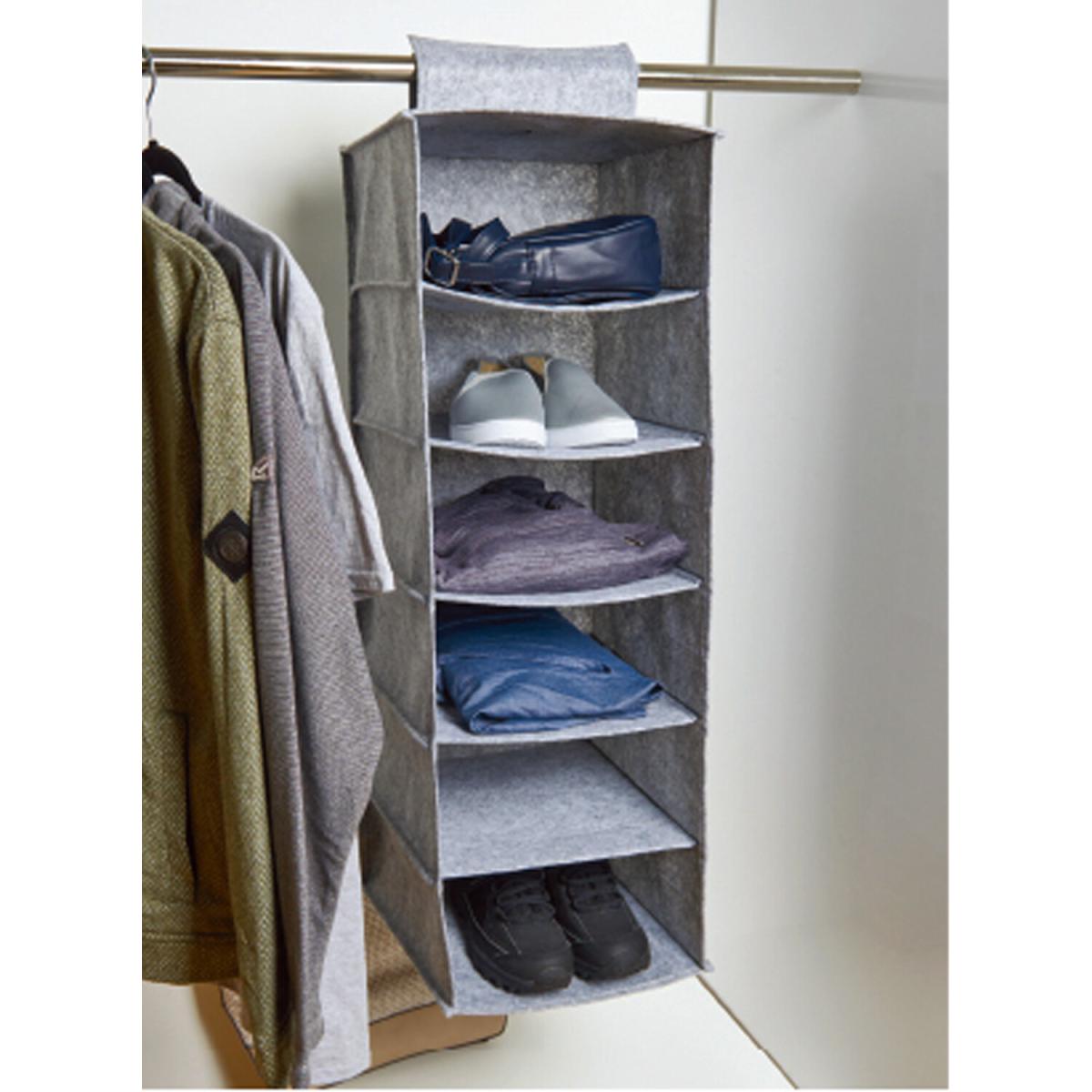 Keep your wardrobe organised with this soft and stylish Premium Grey Felt Shelf Garment Organiser. With six handy shelves, this organiser will easily hang in your wardrobe and is great for storing sweaters, t-shirts, shoes and accessories.