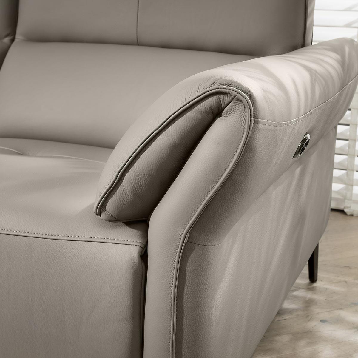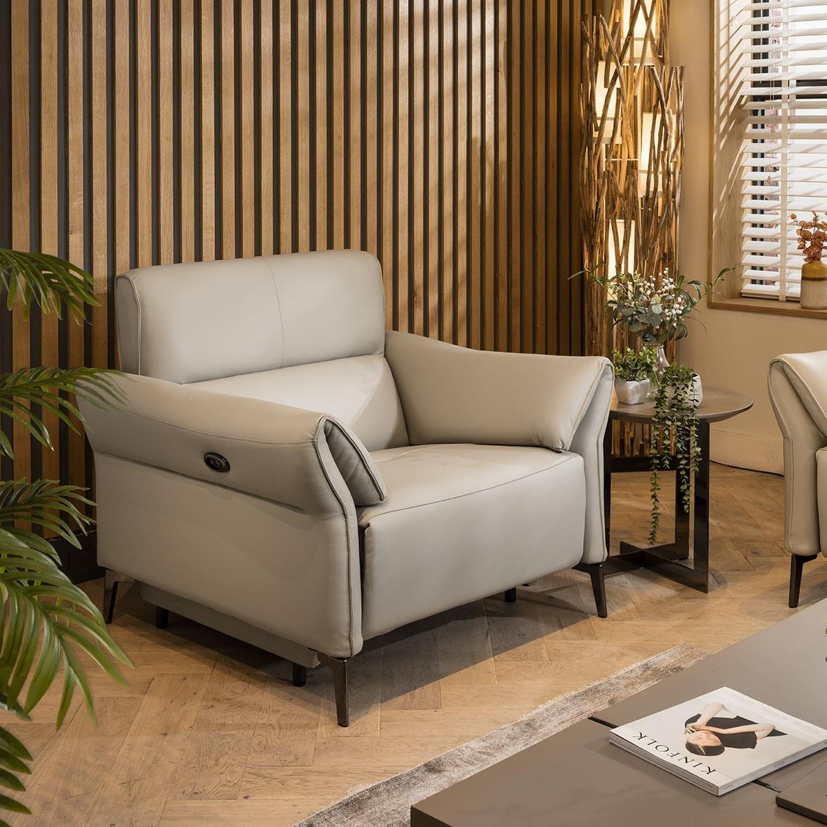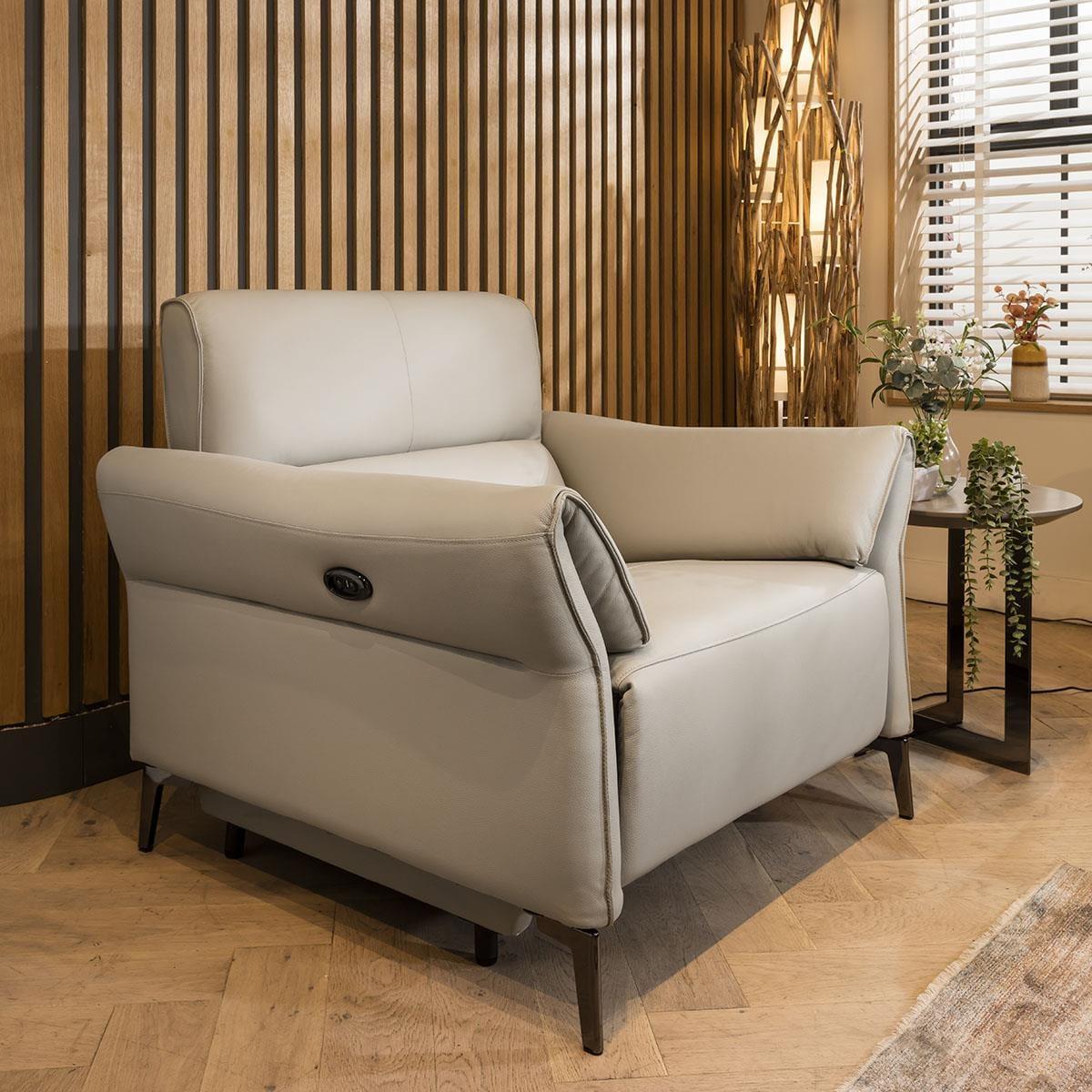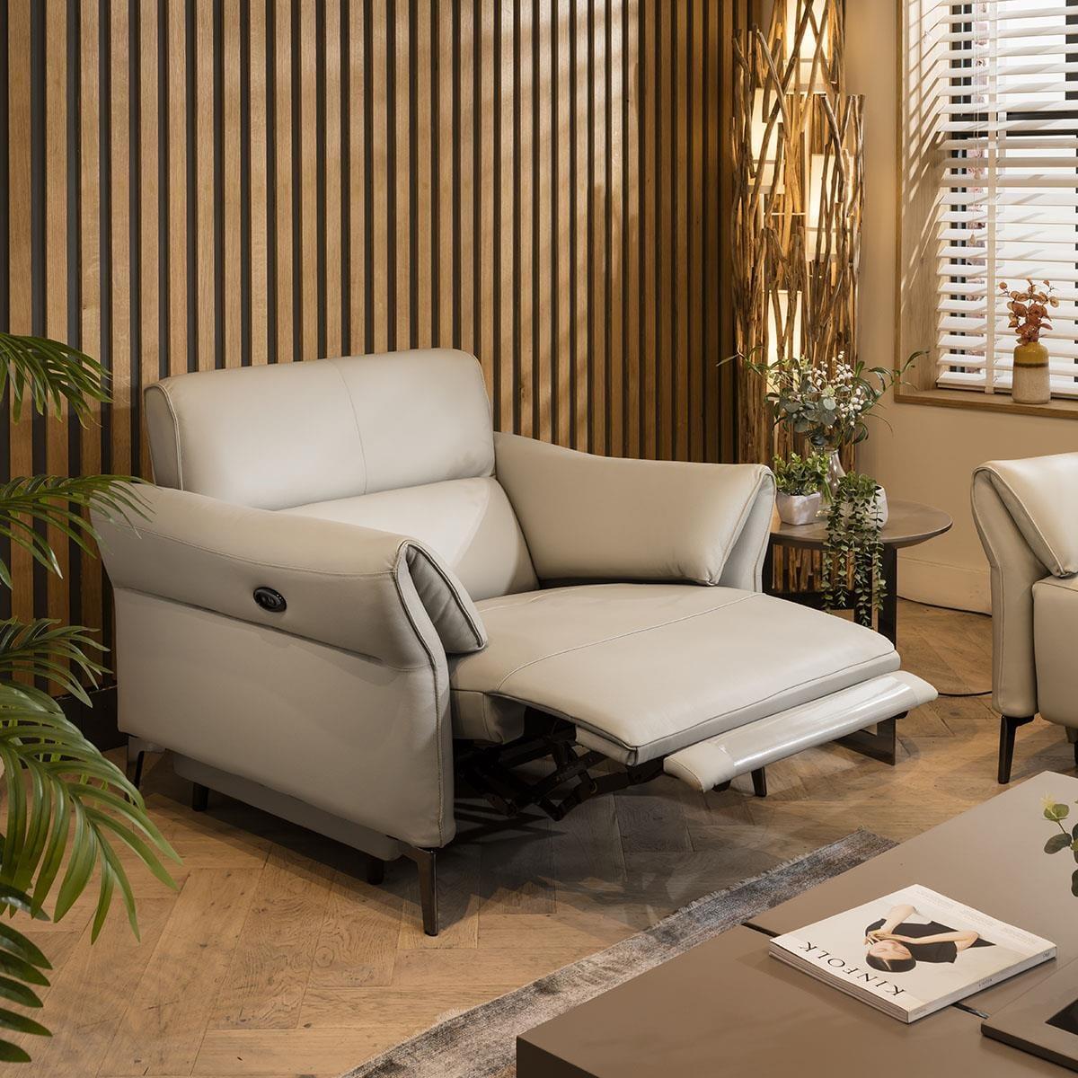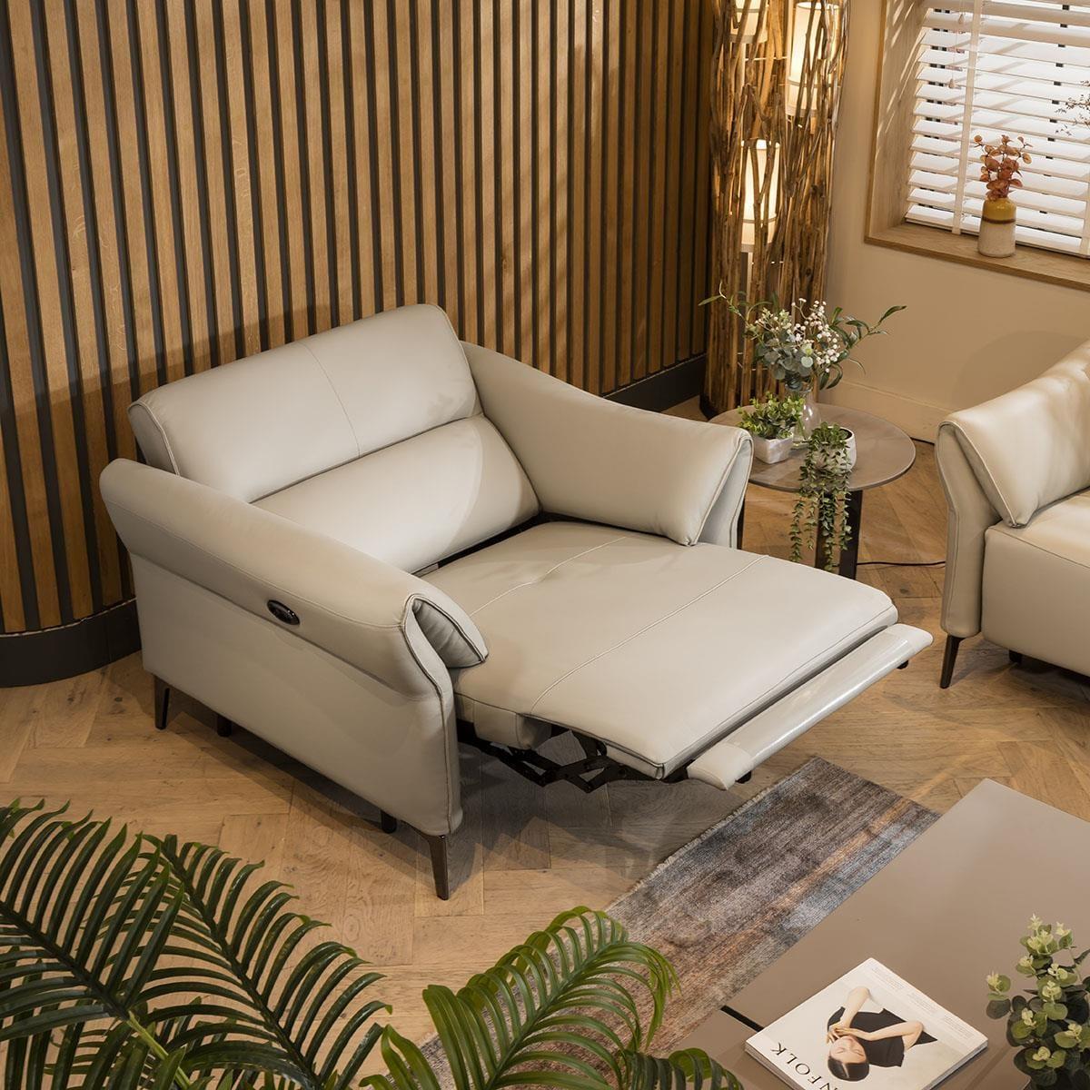 It's the ultimate armchair for your modern living room: the premium leather stone beige powered recliner chair. With its sleek and sophisticated design, this recliner arm chair is the perfect addition to any modern space. The stunning stone beige leather with the electric-powered recliner provides superior comfort. Crafted with amazing build quality, this chair is designed to last. The high back design ensures maximum comfort and support, while the recliner controls on the side of the armchair make it easy to adjust to your desired position. The 3.5m power cable provides ample reach, giving you the flexibility to place the chair anywhere in your room. Made with premium genuine leather on the seat and arms, this recliner armchair exudes luxury and style. The back and outer-arms are made from high-quality faux leather, the material is easy to clean, durable, and gives a high-end finish to your living room. The electric-powered recliner adds a touch of sophistication to your space, allowing you to relax in style. Whether you're watching your favourite TV show, reading a book, or simply lounging, this lounge chair will make your experience one to remember. Overall, this premium leather stone beige recliner armchair is the perfect combination of comfort and style. With its high back design, electric-powered recliner, and amazing build quality, it is a luxurious addition to any modern living room. W102cm D92cm H101cm This armchair requires some assembly - the legs need to be attached Genuine leather on the seats & arms. UKFR faux leather on outer-arms and back